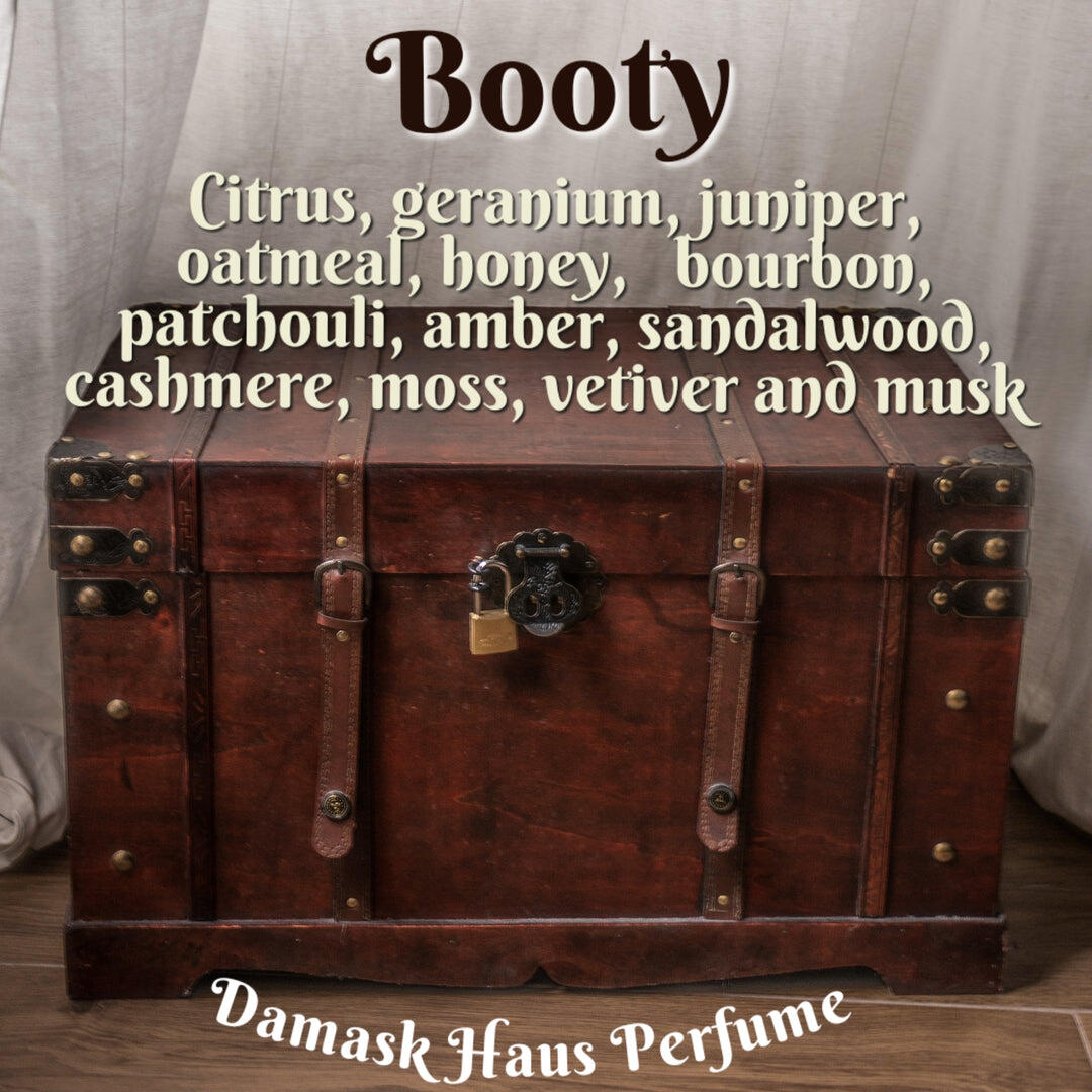 Booty podle Damask Haus je Woody Aromatic vůně pro ženy a muže. Booty byl/a uveden/a v roce 2020. "Nosem" za touto vůní je Bri Beyer. Vrchní tóny jsou Citrusy a Jalovec; střední tóny jsouBourbonská whisky, Pelargónie a Ovesné mléko ; základní tóny jsou Pačuli, Vetiver, Med, Mech, Santalové dřevo, Jantar (ambra), Pižmo a Kašmírové dřevo.
