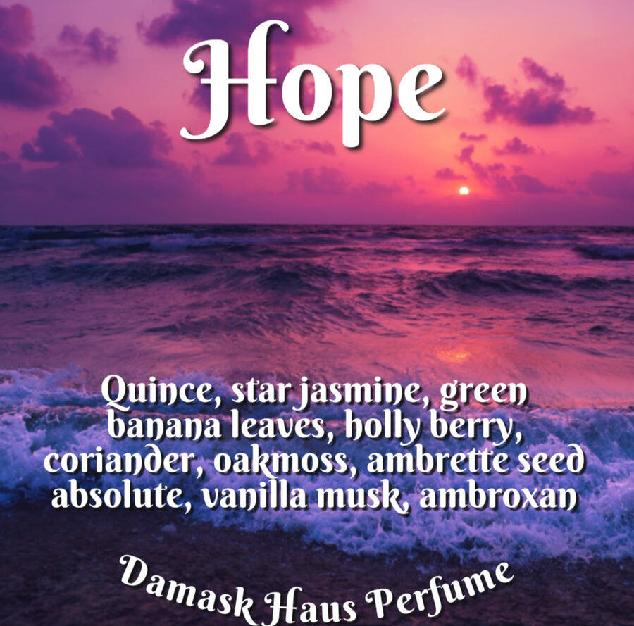 Hope podle Damask Haus je Floral Woody Musk vůně pro ženy a muže. Hope byl/a uveden/a v roce 2021. "Nosem" za touto vůní je Bri Beyer. Vrchní tóny jsou Banánový list, Kdoule a Cesmína; střední tóny jsouJasmín mnohokvětý a Koriandr ; základní tóny jsou Ambroxan, Ambrette (přírodní pižmo), Dubový mech a Pižmo.
