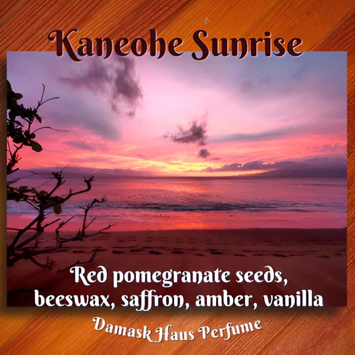 Kaneohe Sunrise podle Damask Haus je Orientální Vanilla vůně pro ženy a muže. Kaneohe Sunrise byl/a uveden/a v roce 2022. "Nosem" za touto vůní je Bri Beyer. Vrchní tón je Granátové jablko ; střední tón jeŠafrán ; základní tóny jsou Včelí vosk, Vanilka a Jantar (ambra).