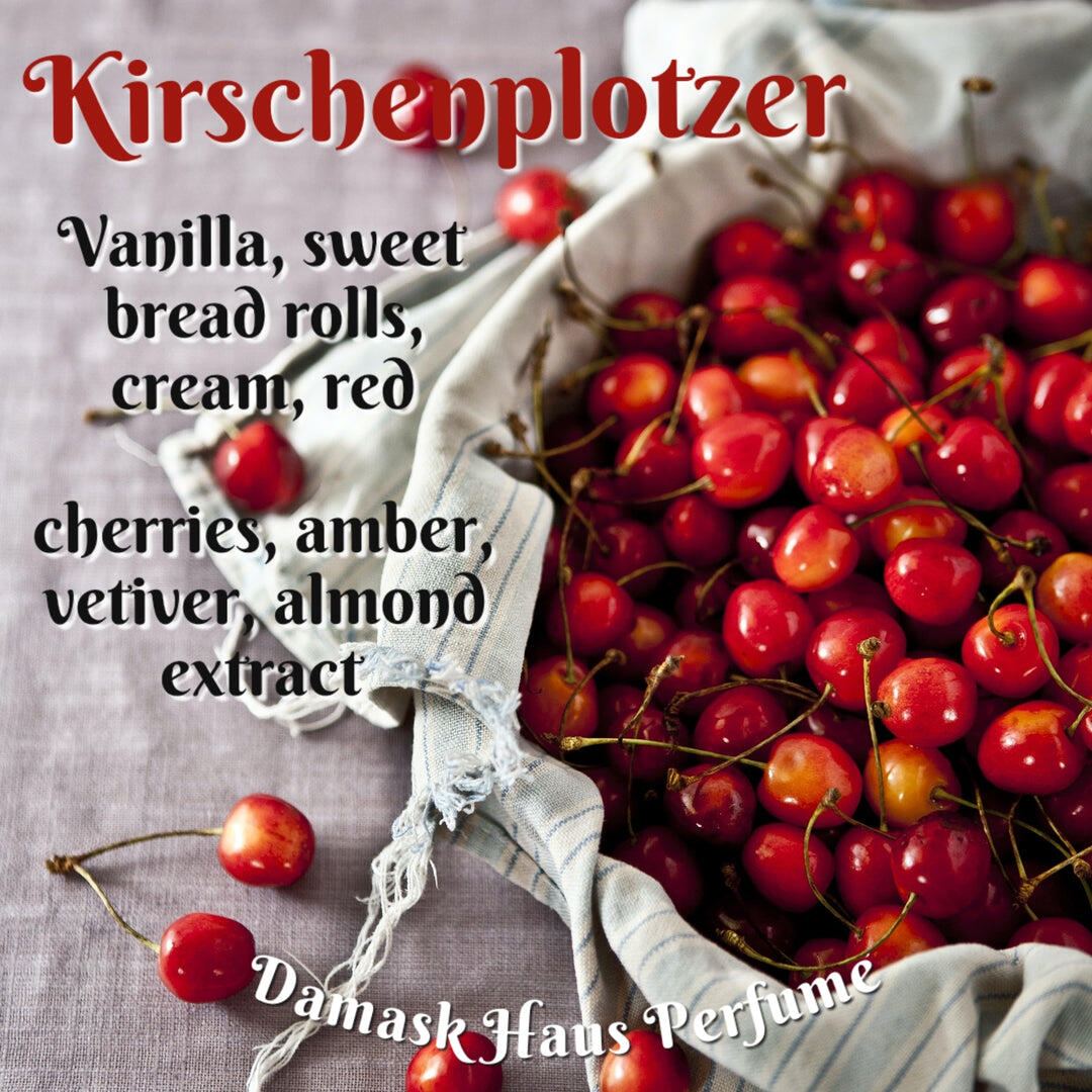 Kirschenplotzer podle Damask Haus je Orientální Vanilla vůně pro ženy a muže. Kirschenplotzer byl/a uveden/a v roce 2021. "Nosem" za touto vůní je Bri Beyer. Vrchní tón je Třešeň ; střední tóny jsouCreamy notes, Mandle a Chléb ; základní tóny jsou Vanilka, Vetiver a Jantar (ambra).