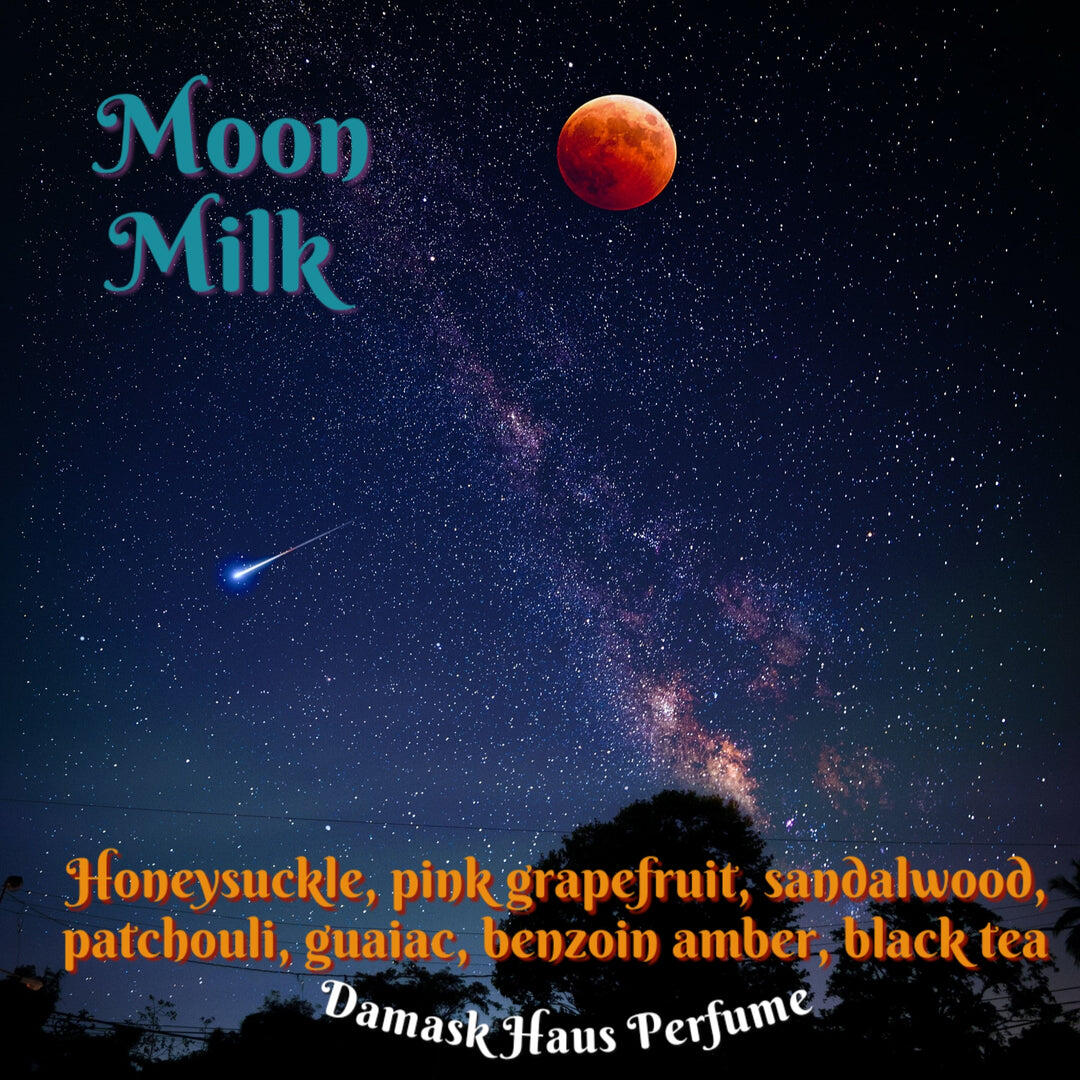 Moon Milk podle Damask Haus je Woody Aromatic vůně pro ženy a muže. Moon Milk byl/a uveden/a v roce 2022. "Nosem" za touto vůní je Bri Beyer. Vrchní tón je Růžový grapefruit ; střední tóny jsouZimolez a Černý čaj ; základní tóny jsou Santalové dřevo, Guajakové dřevo, Pačuli a Benzoin.