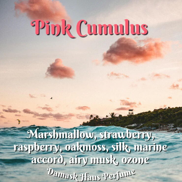 Pink Cumulus podle Damask Haus je Aromatic Fruity vůně pro ženy a muže. Pink Cumulus byl/a uveden/a v roce 2022. "Nosem" za touto vůní je Bri Beyer. Vrchní tóny jsou Ozonové tóny, Jahoda, Maliny a Mořské tóny; střední tóny jsouMarshamallow a Hedvábí ; základní tóny jsou Dubový mech a Pižmo.