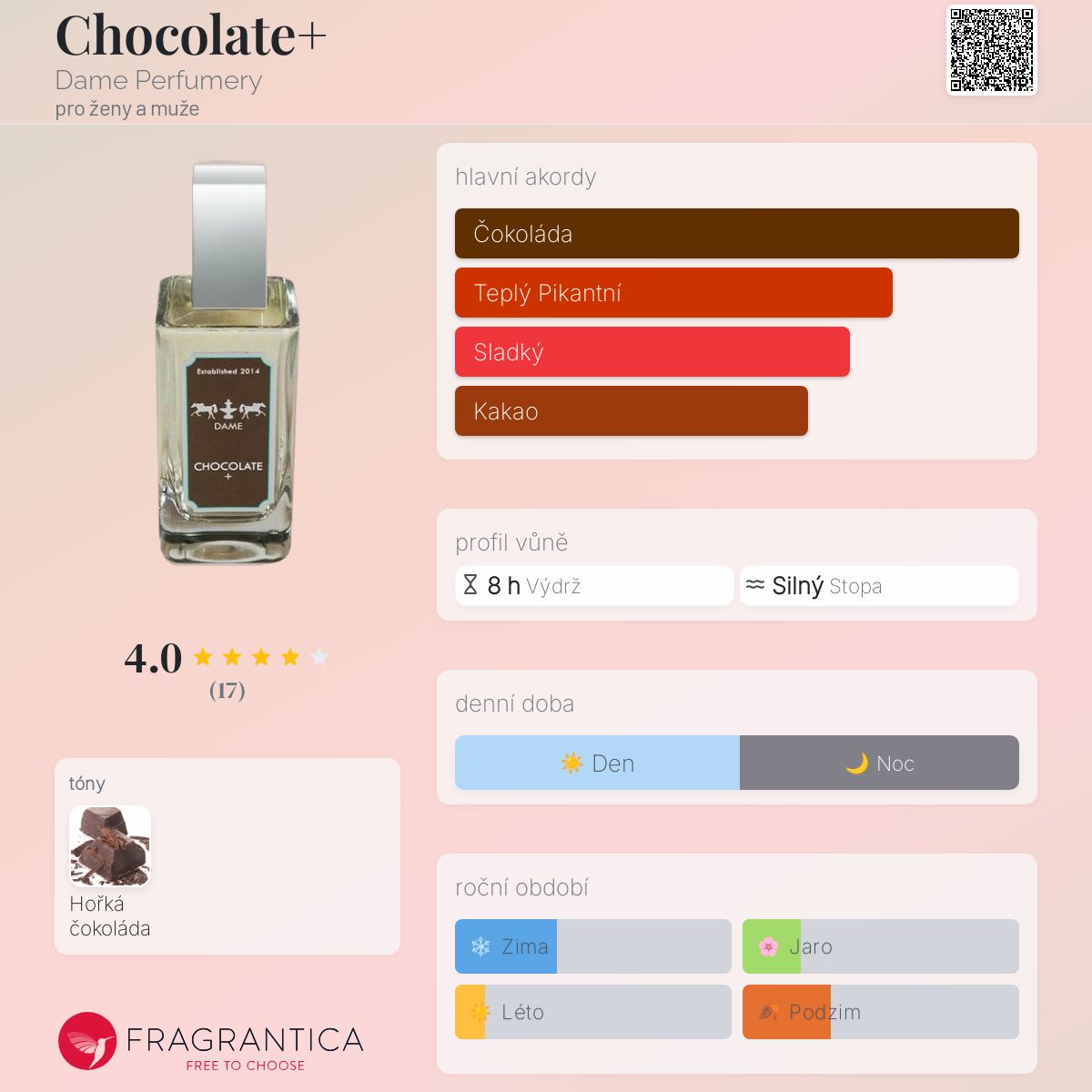 Chocolate+ podle Dame Perfumery je Orientální Vanilla vůně pro ženy a muže. Chocolate+ byl/a uveden/a v roce 2022. Vrchní tón je Čokoláda ; střední tón jeČokoláda ; základní tón je Čokoláda.