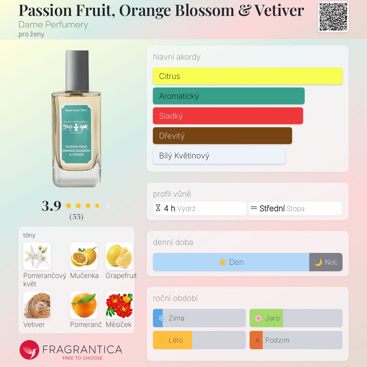 Passion Fruit, Orange Blossom & Vetiver podle Dame Perfumery je Floral Woody Musk vůně pro ženy. Passion Fruit, Orange Blossom & Vetiver byl/a uveden/a v roce 2014. "Nosem" za touto vůní je Jeffrey Dame. Vrchní tóny jsou Mučenka, Grapefruit, Pomeranč a Aksamitník; střední tóny jsouPomerančový květ, Hedione a Ambrette (přírodní pižmo) ; základní tóny jsou Vetiver, Cedr a Pižmo.