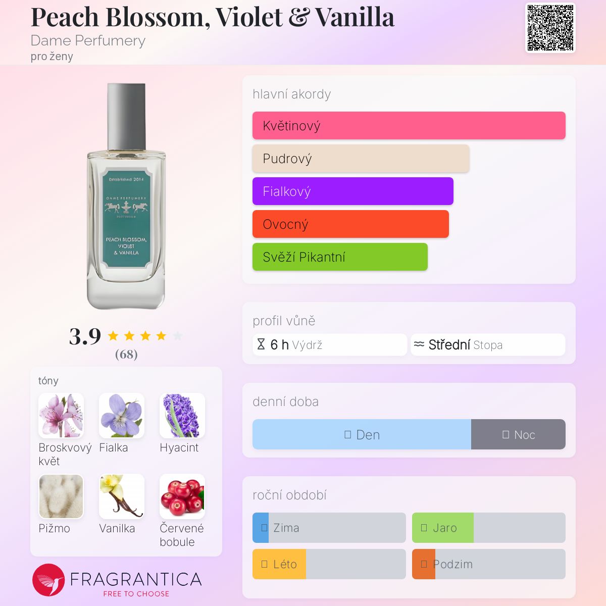 Peach Blossom, Violet & Vanilla podle Dame Perfumery je Floral Fruity vůně pro ženy. Peach Blossom, Violet & Vanilla byl/a uveden/a v roce 2014. "Nosem" za touto vůní je Jeffrey Dame. Vrchní tóny jsou Broskvový květ, Hyacint, Červené bobule a Bergamot; střední tóny jsouParmská fialka, Jasmín a Růže ; základní tóny jsou Pižmo, Tahitská vanilka a Naplavené dříví.