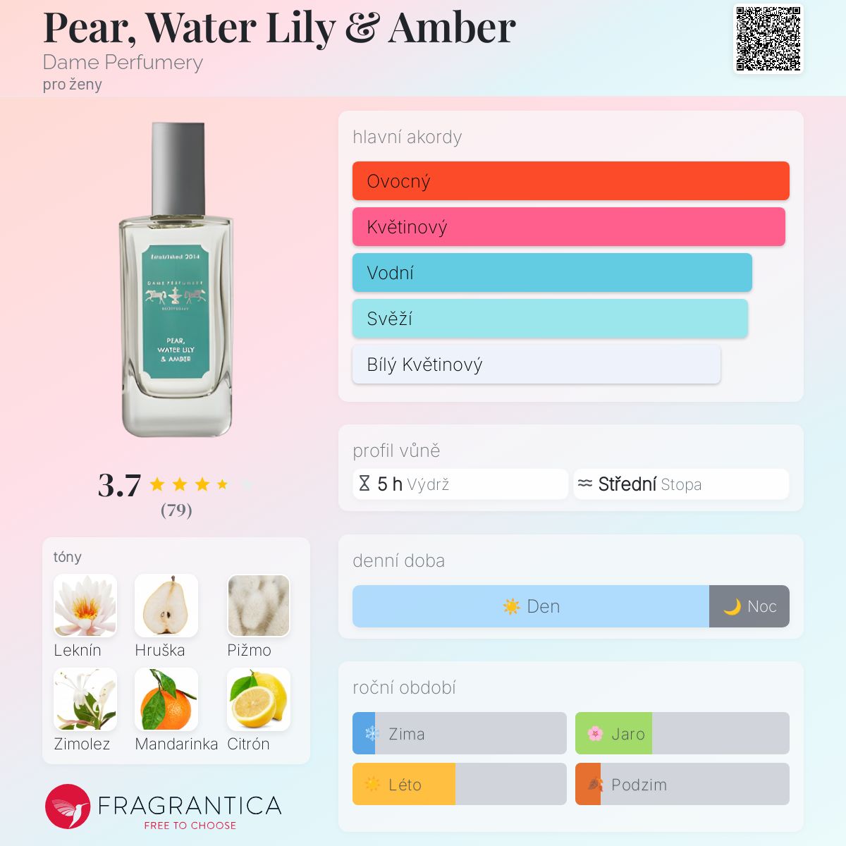 Pear, Water Lily & Amber podle Dame Perfumery je Floral Fruity vůně pro ženy. Pear, Water Lily & Amber byl/a uveden/a v roce 2014. Vrchní tóny jsou Hruška, Mandarinka a Citrón; střední tóny jsouLeknín, Zimolez, Jasmín a Třešňový květ ; základní tóny jsou Pižmo, Jantar (ambra), Vanilka a Santalové dřevo.