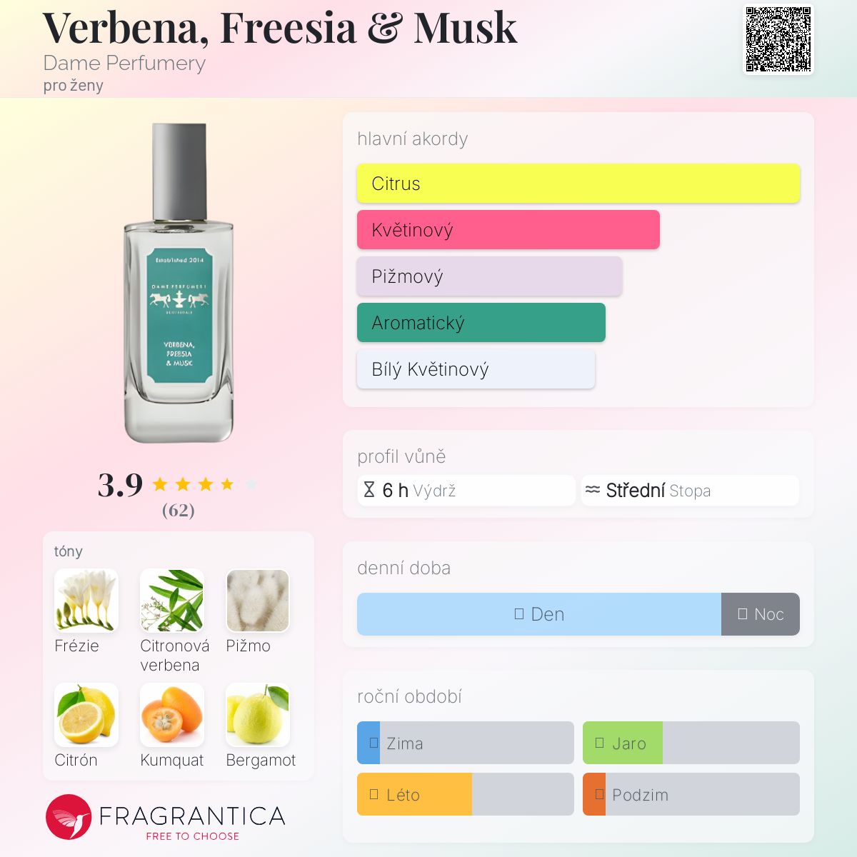 Verbena, Freesia & Musk podle Dame Perfumery je Citrus vůně pro ženy. Verbena, Freesia & Musk byl/a uveden/a v roce 2014. "Nosem" za touto vůní je Jeffrey Dame. Vrchní tóny jsou Citronová verbena, Citrón, Kumquat a Bergamot; střední tóny jsouFrézie, Pomerančový květ a Lilie ; základní tóny jsou Pižmo a Dřevité tóny.