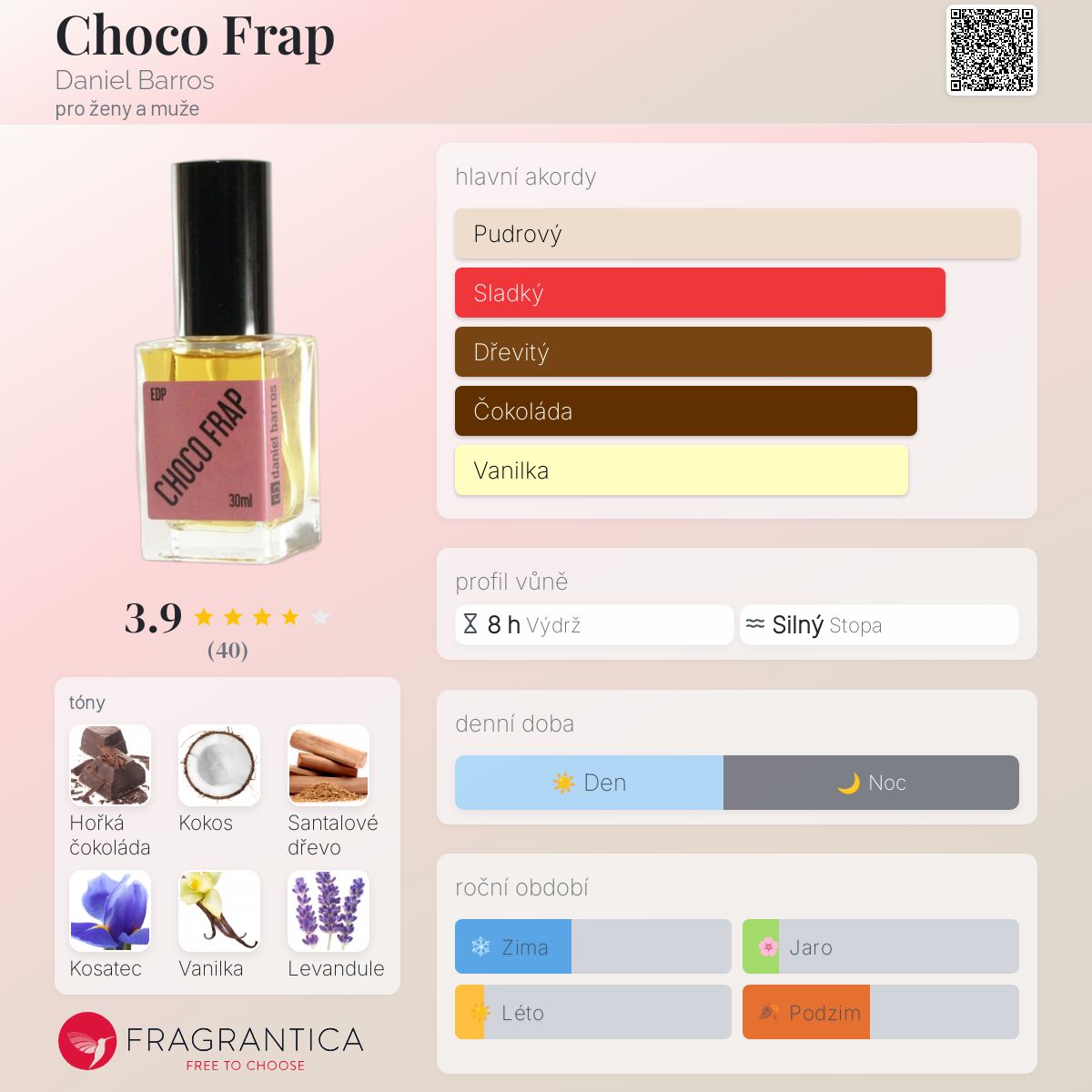 Choco Frap podle Daniel Barros je Orientální Vanilla vůně pro ženy a muže. Choco Frap byl/a uveden/a v roce 2016. "Nosem" za touto vůní je Daniel Barros. Vrchní tóny jsou Levandule, Citrón, Bergamot a Zelené listí; střední tóny jsouKokos, Kosatec, Mandle a Otočník ; základní tóny jsou Hořká čokoláda, Santalové dřevo, Vanilka, Kašmír a Pižmo.
