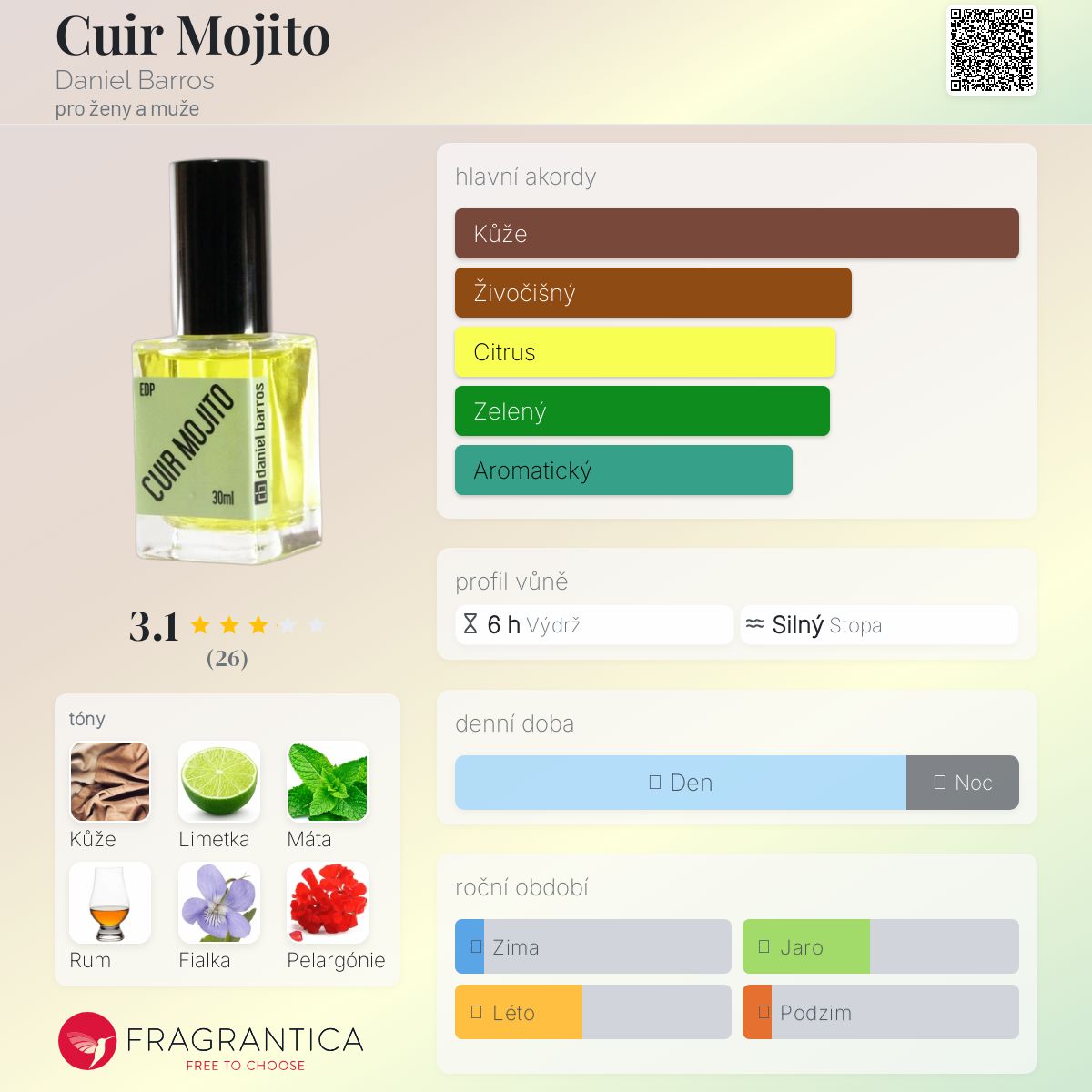 Cuir Mojito podle Daniel Barros je Leather vůně pro ženy a muže. Cuir Mojito byl/a uveden/a v roce 2016. "Nosem" za touto vůní je Daniel Barros. Vrchní tóny jsou Limetka, Máta, Rum, Šafrán a Tráva; střední tóny jsouFialka, Pelargónie, Konvalinka a Pačuli ; základní tóny jsou Kůže, Kašmír, Pižmo a Dubový mech.