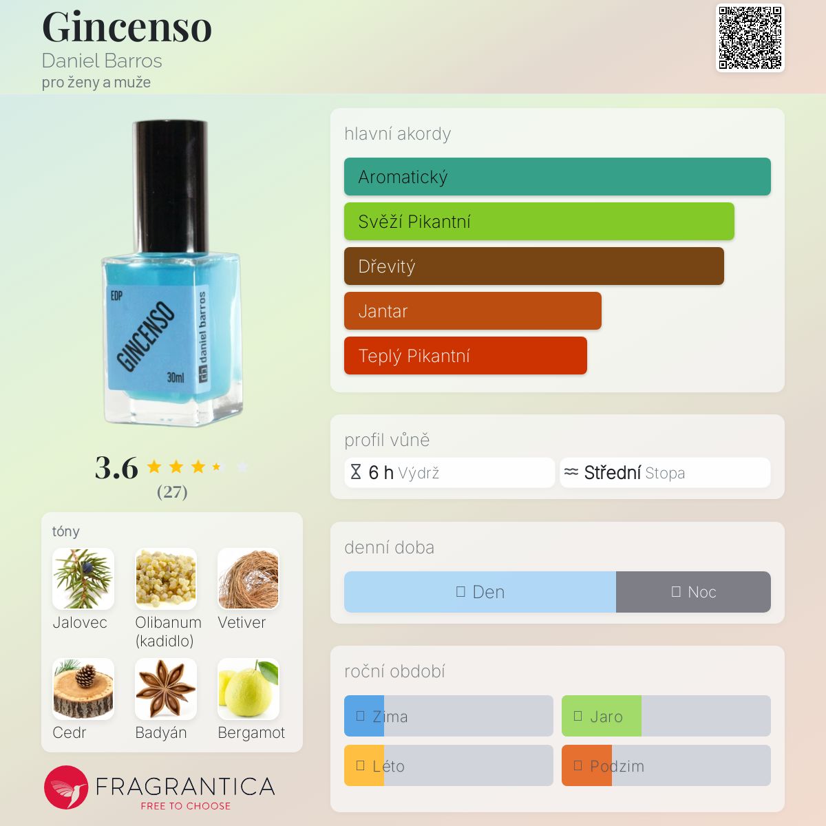 Gincenso podle Daniel Barros je Aromatic Spicy vůně pro ženy a muže. Gincenso byl/a uveden/a v roce 2016. "Nosem" za touto vůní je Daniel Barros. Vrchní tóny jsou Jalovec, Badyán, Bergamot a Růžový pepř; střední tóny jsouZázvor, Pelargónie, Muškátový oříšek a Fialka ; základní tóny jsou Olibanum, Vetiver, Cedr, Elimi a Pižmo.