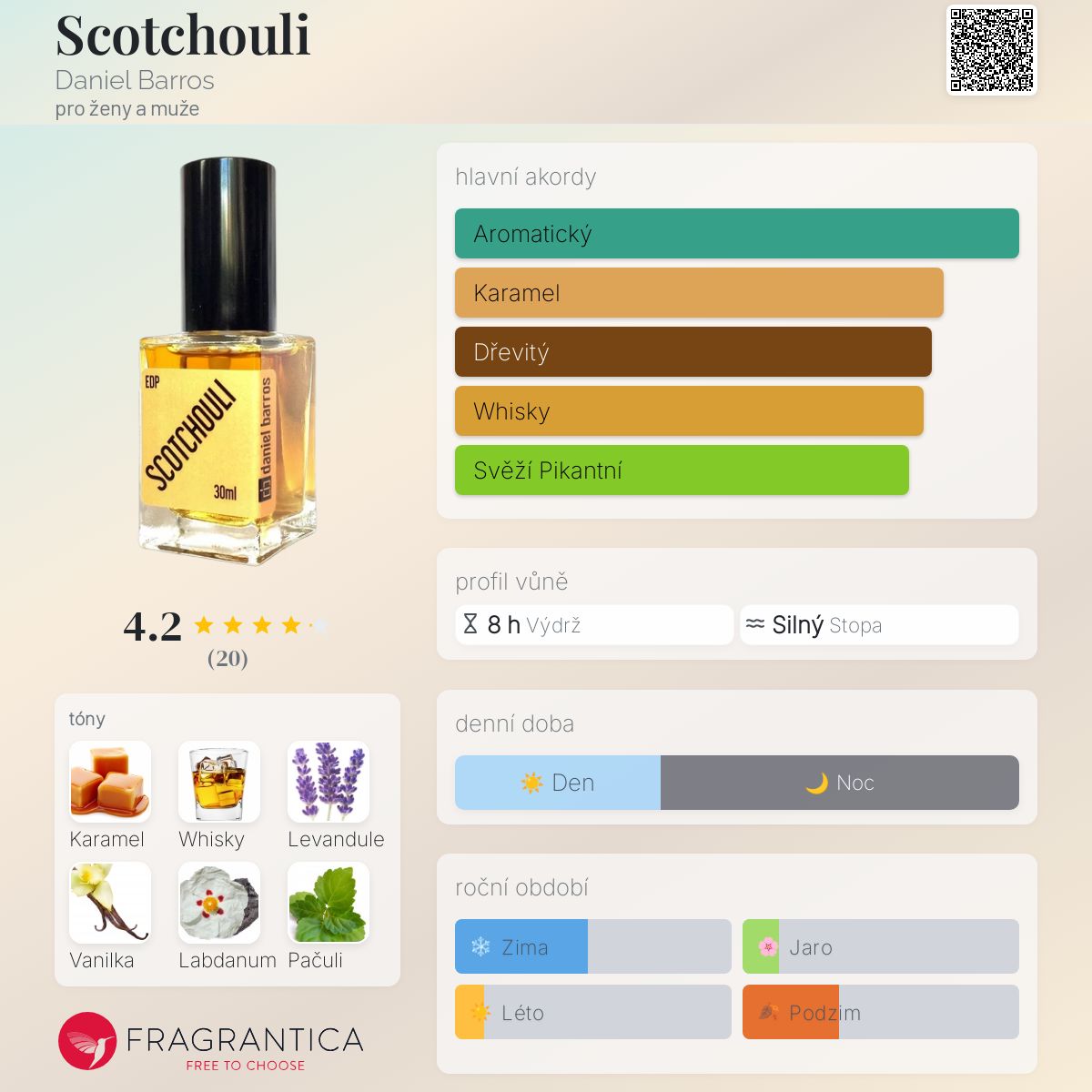 Scotchouli podle Daniel Barros je Orientální Woody vůně pro ženy a muže. Scotchouli byl/a uveden/a v roce 2016. "Nosem" za touto vůní je Daniel Barros. Vrchní tóny jsou Whisky, Šalvěj, Tymián, Máta a Bergamot; střední tóny jsouLevandule, Pačuli, Pelargónie a Tabák ; základní tóny jsou Karamel, Vanilka, Labdanum a Dubový mech.