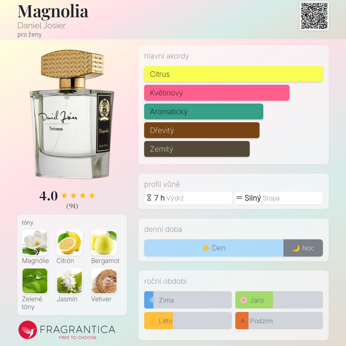 Magnolia podle Daniel Josier je Floral vůně pro ženy. "Nosem" za touto vůní je Daniel Josier. Vrchní tóny jsou Citrón, Bergamot a Zelené tóny; střední tóny jsouMagnólie, Jasmín, Růže a Nard himálajský ; základní tóny jsou Vetiver, Pačuli, Santalové dřevo a Vanilka.