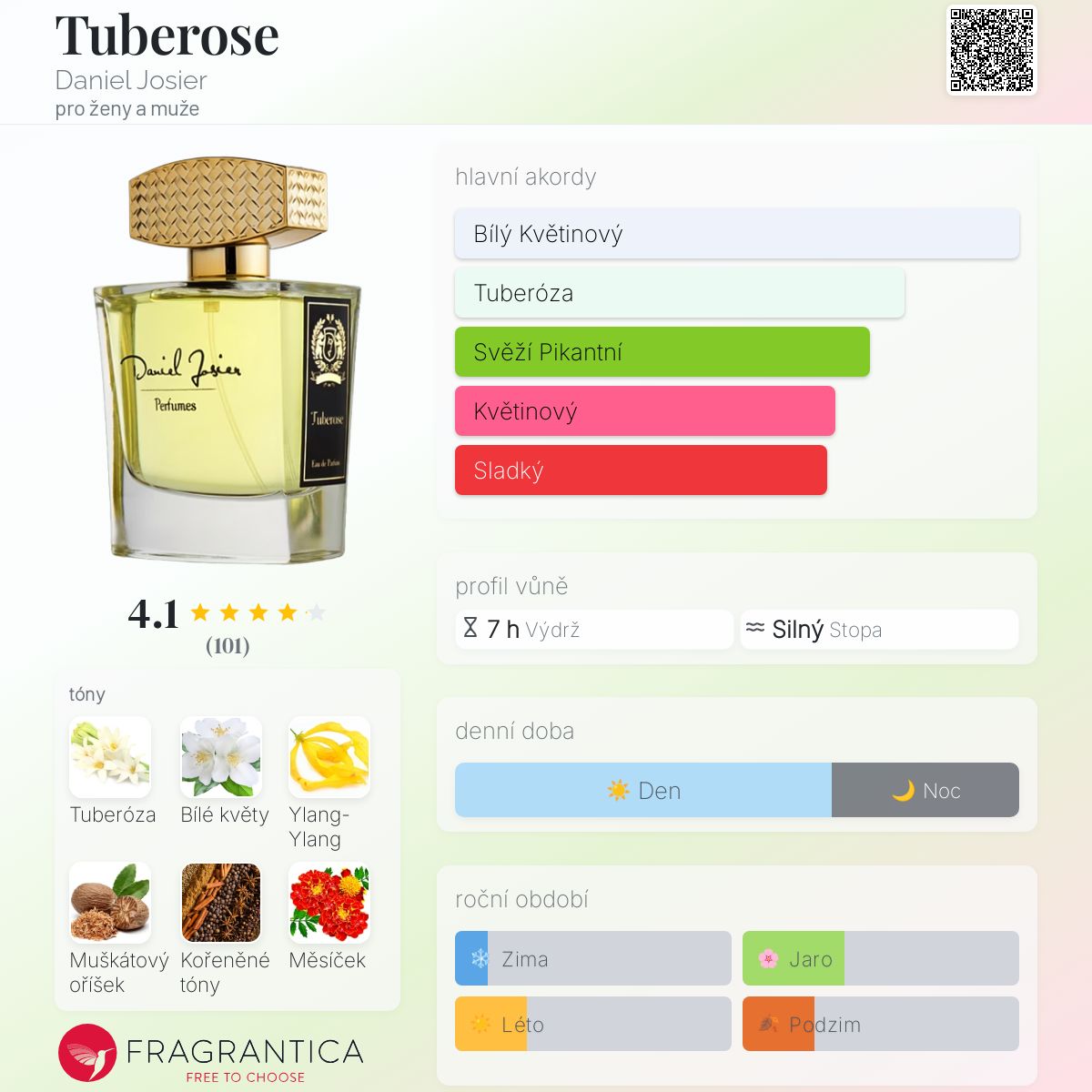 Tuberose podle Daniel Josier je Chypre Floral vůně pro ženy a muže. "Nosem" za touto vůní je Daniel Josier. Vrchní tóny jsou Muškátový oříšek, Koření, Aksamitník, Grapefruit a Růžový pepř; střední tóny jsouTuberóza, Bílé květy, Ylang-Ylang, Otočník a Vonokvětka ; základní tóny jsou Vanilkový květ, Jantar (ambra), Bílé pižmo a Dubový mech.