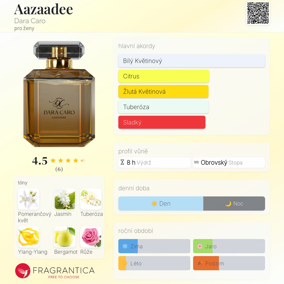Aazaadee podle Dara Caro je vůně pro ženy. Vrchní tóny jsou Pomerančový květ a Bergamot; střední tóny jsouJasmín, Tuberóza a Bulharská růže ; základní tóny jsou Ylang-Ylang, Pačuli a Vanilka.