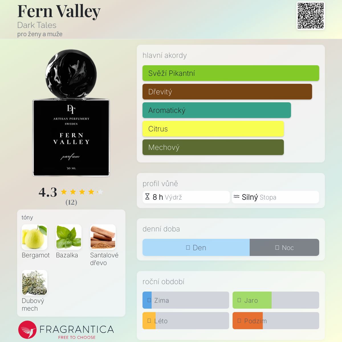 Fern Valley podle Dark Tales je Aromatic Green vůně pro ženy a muže. Fern Valley byl/a uveden/a v roce 2023. "Nosem" za touto vůní je Arina P. Franzén. Vrchní tóny jsou Bergamot a Bazalka; základní tóny jsou Santalové dřevo a Dubový mech.