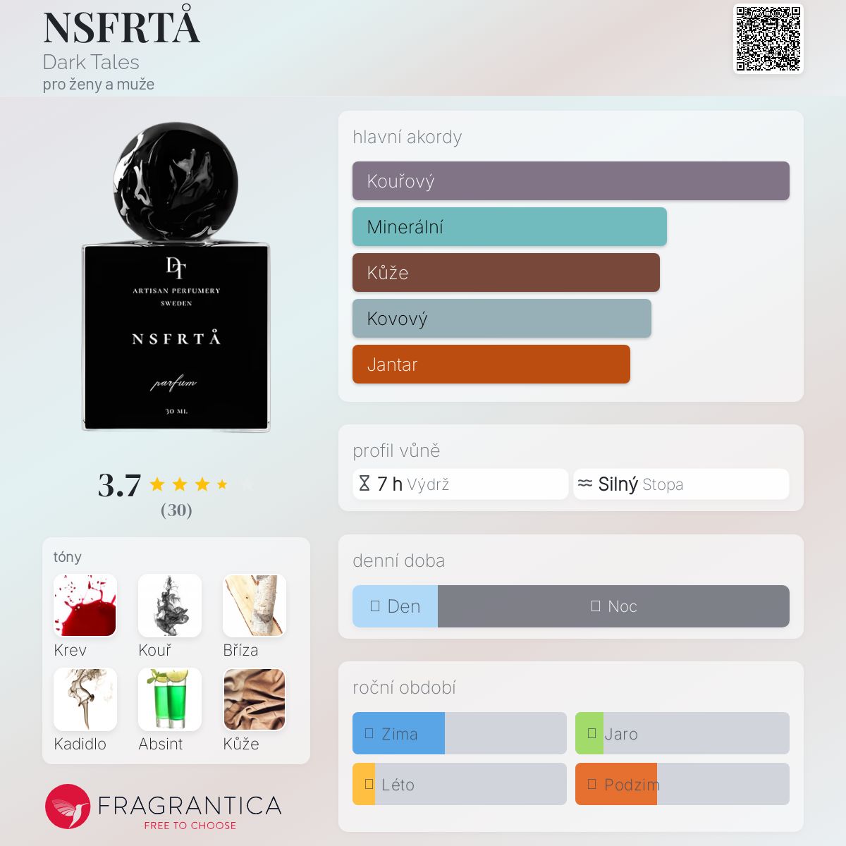 NSFRTÅ podle Dark Tales je Floral vůně pro ženy a muže. Toto je nová vůně. NSFRTÅ byl/a uveden/a v roce 2025. "Nosem" za touto vůní je Arina P. Franzén. Vrchní tóny jsou Kouř, Bříza, Absint a Černý pepř; střední tóny jsouKrev, Černá růže a Pačuli ; základní tóny jsou Kůže, Kadidlo, Ambra a Vetiver.