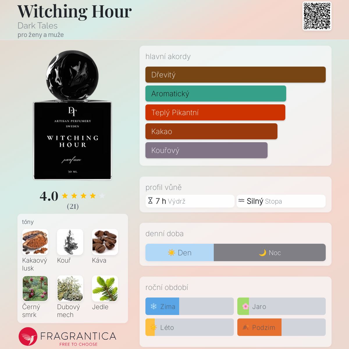 Witching Hour podle Dark Tales je Aromatic vůně pro ženy a muže. Toto je nová vůně. Witching Hour byl/a uveden/a v roce 2024. "Nosem" za touto vůní je Arina P. Franzén. Vrchní tóny jsou Kakao, Kouř a Káva; střední tóny jsouFazole tonka, Cypriolový olej a Maté ; základní tóny jsou Černý smrk, Dubový mech, Jedle balzámová, Cypřiš a Pudrové tóny.