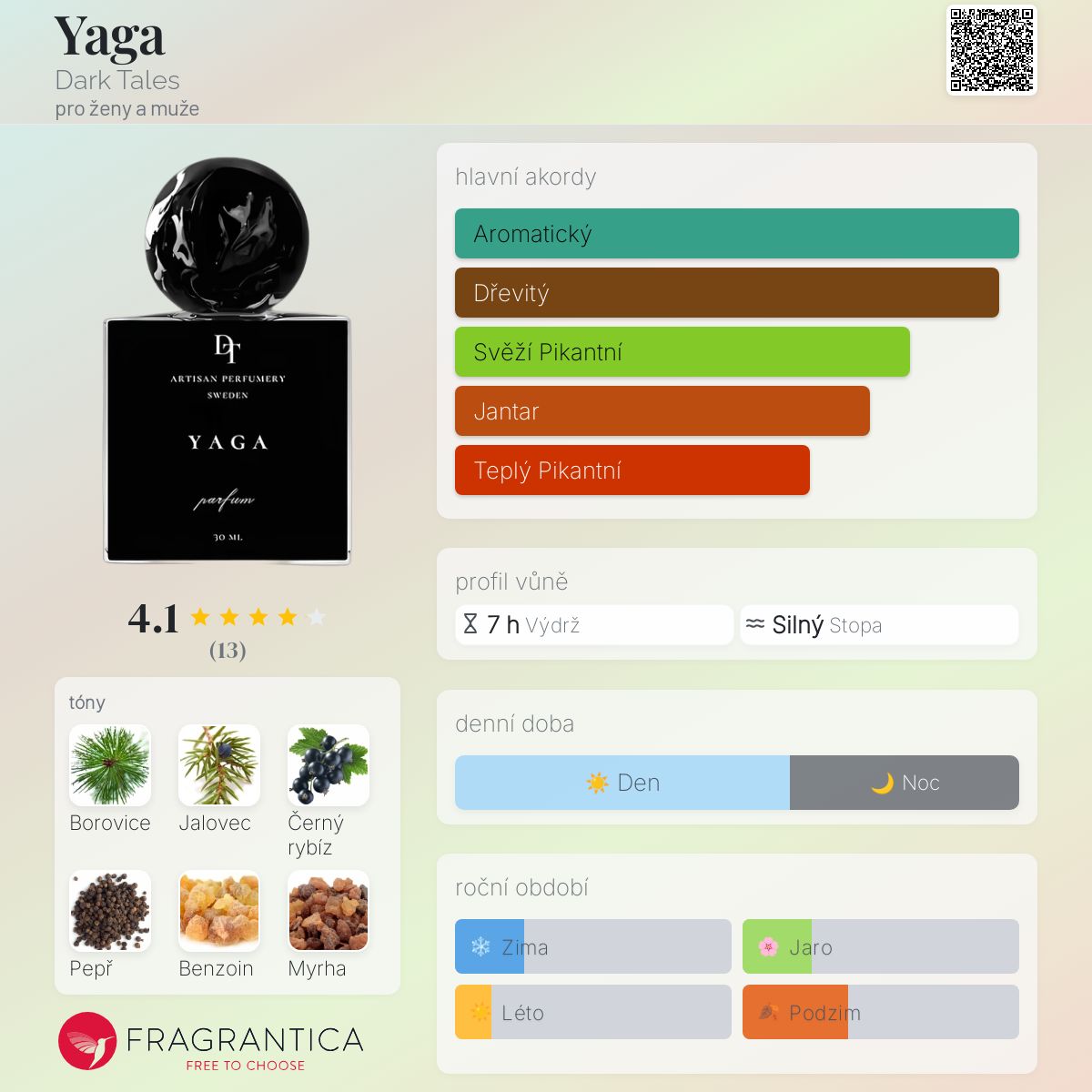 Yaga podle Dark Tales je Woody Spicy vůně pro ženy a muže. Yaga byl/a uveden/a v roce 2020. "Nosem" za touto vůní je Arina P. Franzén. Vrchní tóny jsou Černý rybíz a Černý pepř; střední tóny jsouSibiřská borovice a Jalovec ; základní tóny jsou Benzoin a Myrha.