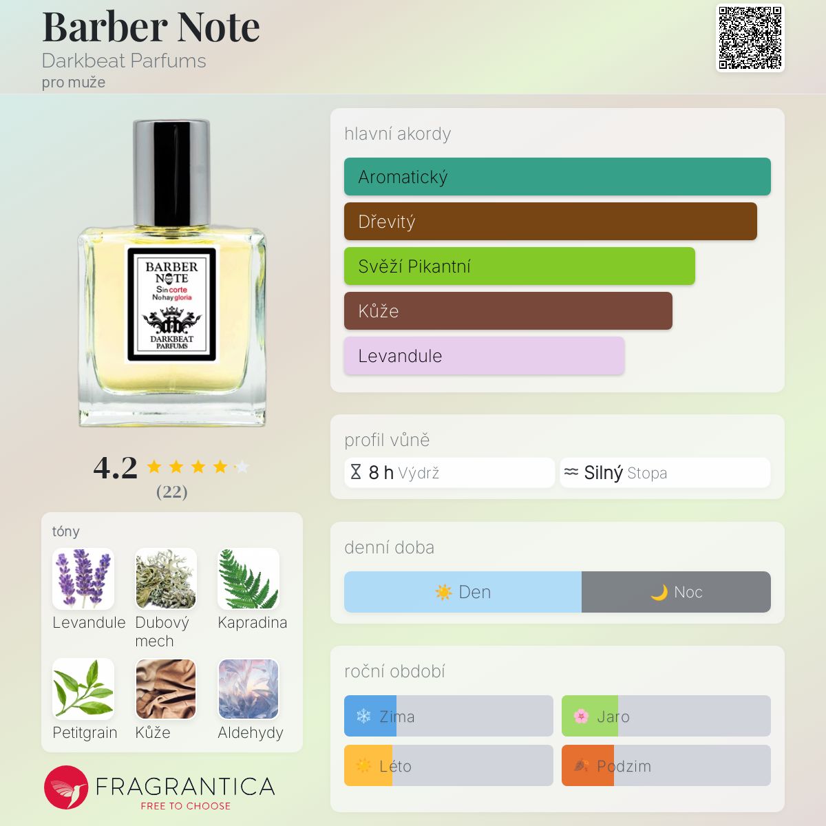 Barber Note podle Darkbeat Parfums je vůně pro muže. Barber Note byl/a uveden/a v roce 2022. "Nosem" za touto vůní je José M. Giraldo. Vrchní tóny jsou Kapradina, Petitgrain, Aldehydy, Máta, Zázvor a Citrón; střední tóny jsouLevandule, Santalové dřevo, Konvalinka, Pelargónie a Růže ; základní tóny jsou Mech, Kůže, Kastoreum, Pižmo, Guajakové dřevo, Kumarin, Cedr, Semiš a Pačuli.