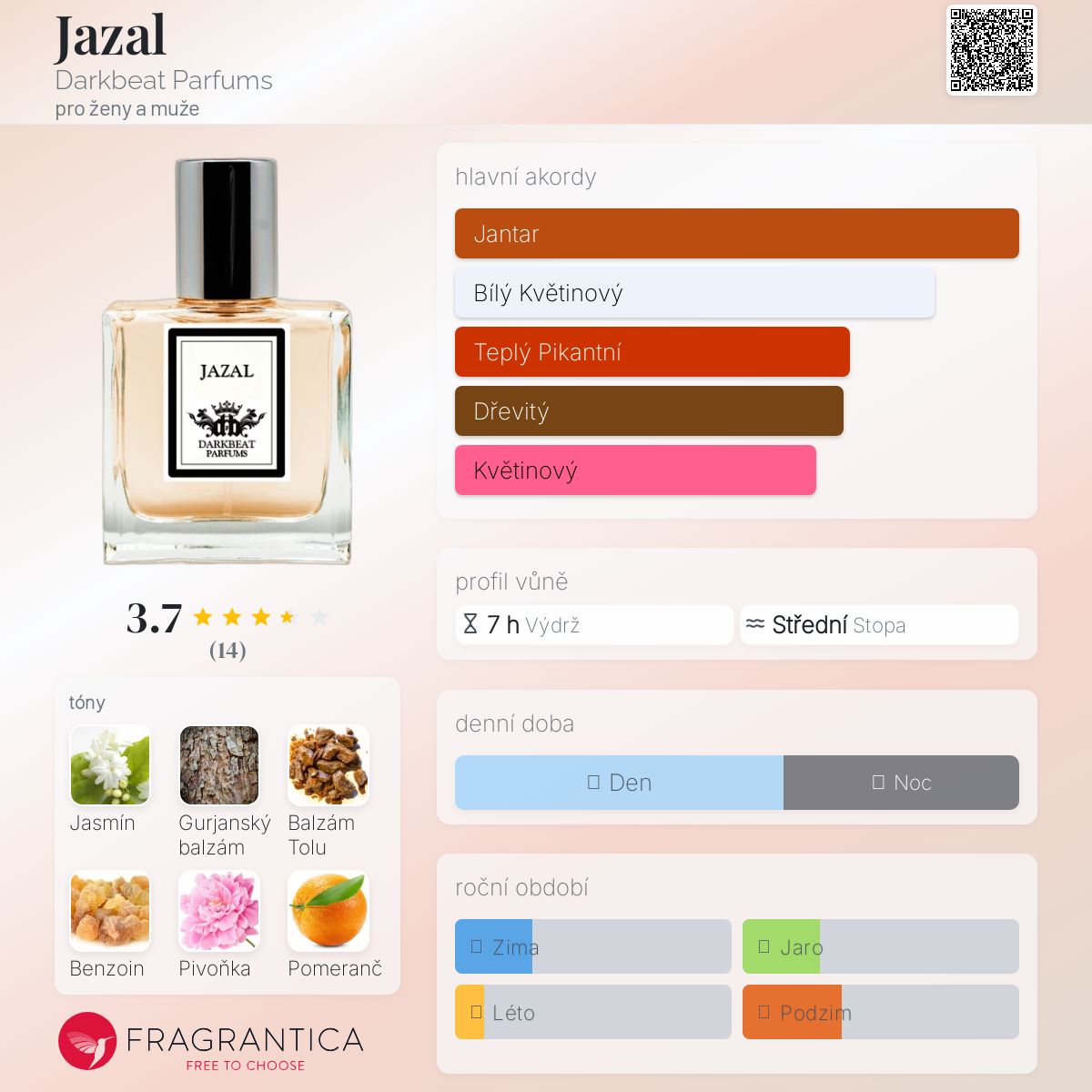 Jazal podle Darkbeat Parfums je vůně pro ženy a muže. Jazal byl/a uveden/a v roce 2021. "Nosem" za touto vůní je José M. Giraldo. Vrchní tóny jsou Sladký pomeranč a Hořký pomeranč; střední tóny jsouJasmín a Pivoňka ; základní tóny jsou Gurjanský balzám, Balzám Tolu, Benzoin a Cedr.