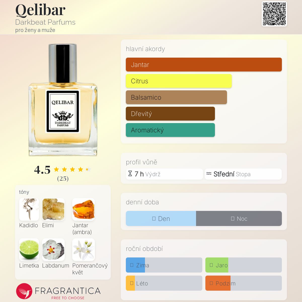 Qelibar podle Darkbeat Parfums je vůně pro ženy a muže. Qelibar byl/a uveden/a v roce 2019. "Nosem" za touto vůní je José M. Giraldo. Vrchní tóny jsou Elimi, Limetka a Bergamot; střední tóny jsouLabdanum, Pomerančový květ, Cedr a Ambra ; základní tóny jsou Kadidlo, Jantar (ambra), Vanilka a Benzoin.