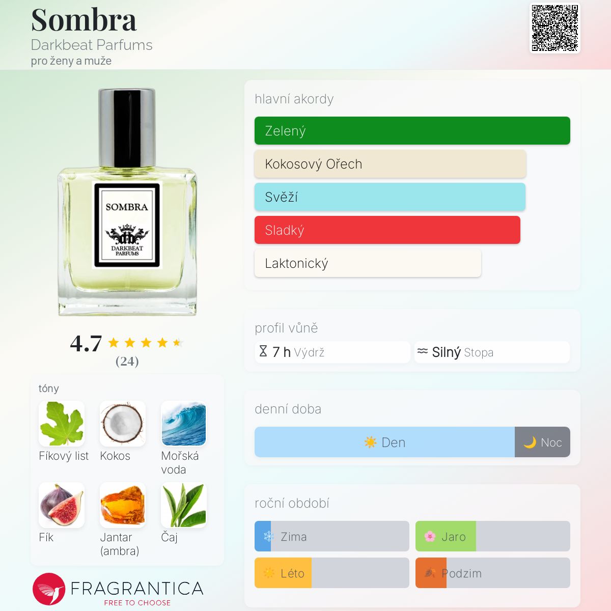 Sombra podle Darkbeat Parfums je vůně pro ženy a muže. Sombra byl/a uveden/a v roce 2021. "Nosem" za touto vůní je José M. Giraldo. Vrchní tóny jsou Kokos, Zelený čaj, Pomeranč a Kardamom; střední tóny jsouFíkový list, Mořské tóny a Fík ; základní tóny jsou Jantar (ambra), Cedr, Aldehydy a Pižmo.