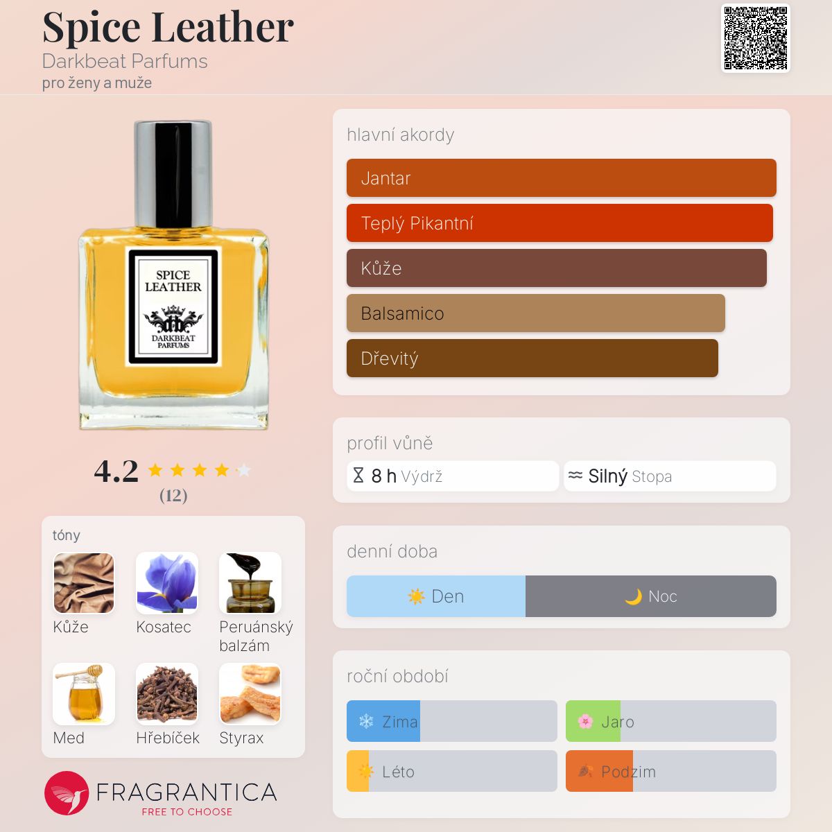 Spice Leather podle Darkbeat Parfums je vůně pro ženy a muže. Spice Leather byl/a uveden/a v roce 2023. "Nosem" za touto vůní je José M. Giraldo. Vrchní tóny jsou Badyán, Pomelo, Bazalka, Třešeň a Yuzu; střední tóny jsouKůže, Kosatec, Med, Hřebíček, Šalvěj a Skořice ; základní tóny jsou Peruánský balzám, Styrax, Virginský cedr, Atlasový cedr, Šafrán a Pižmo.