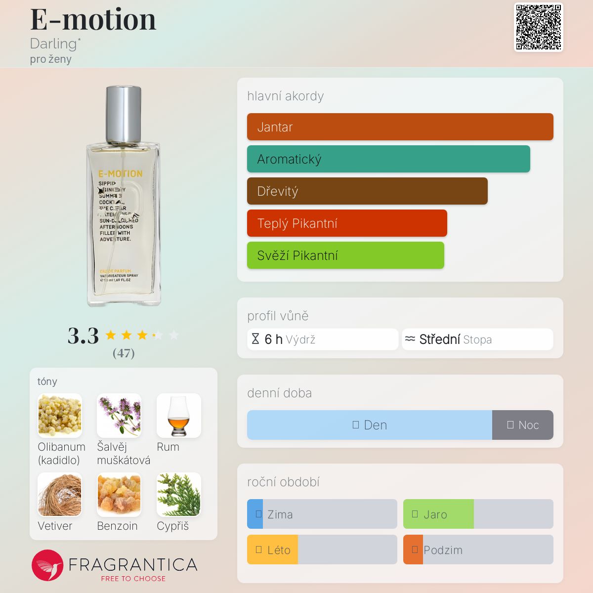 E-motion podle Darling* je Woody Floral Musk vůně pro ženy. E-motion byl/a uveden/a v roce 2023. "Nosem" za touto vůní je Shyamala Maisondieu. Vrchní tóny jsou Šalvěj muškátová, Cypřiš a Fialkový list; střední tóny jsouRum, Hedione a Fíkový list ; základní tóny jsou Olibanum, Vetiver, Benzoin, Fazole tonka a Pačuli.