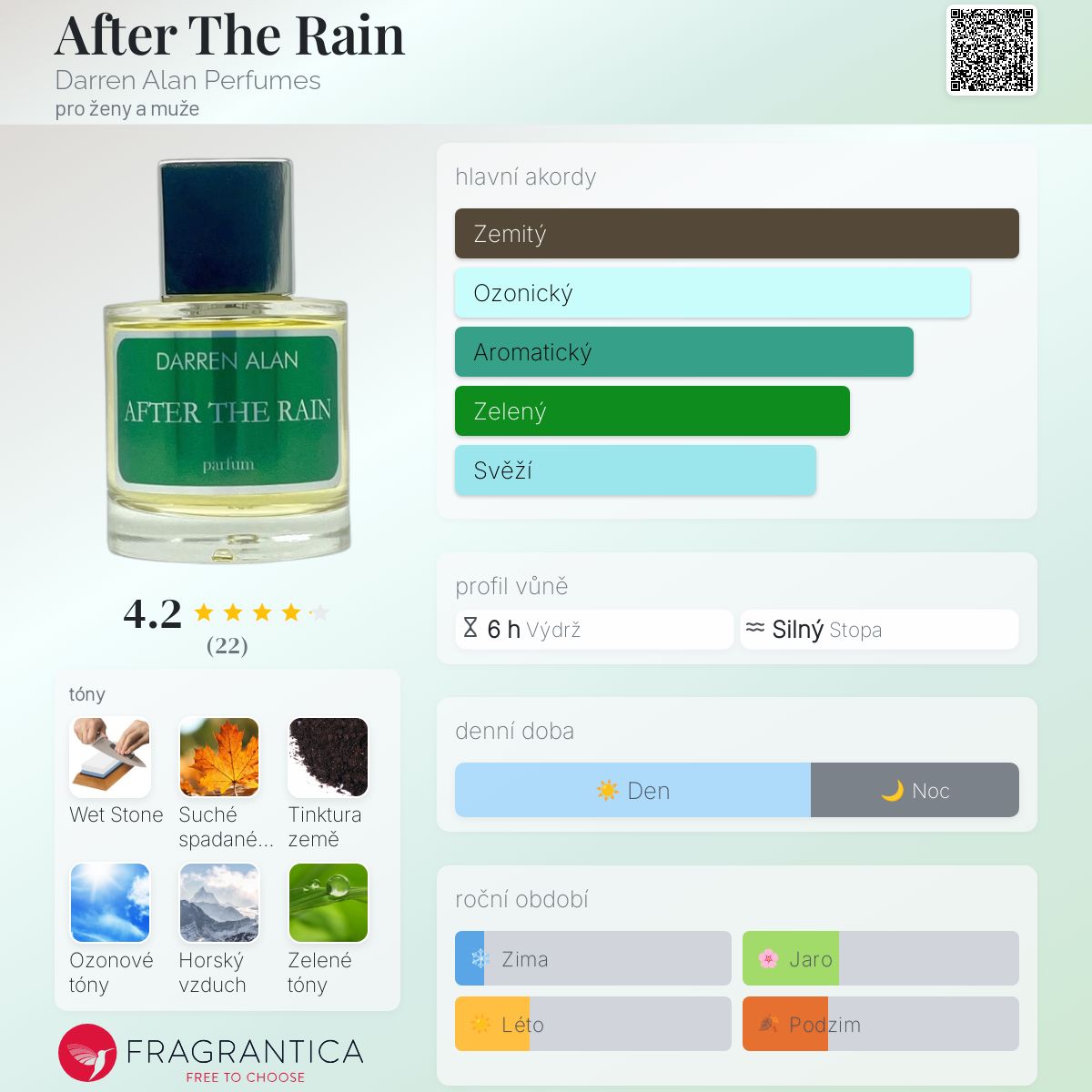 After The Rain podle Darren Alan Perfumes je Aromatic Green vůně pro ženy a muže. After The Rain byl/a uveden/a v roce 2007. "Nosem" za touto vůní je Darren Alan. Vrchní tóny jsou Mokrý kámen, Ozonové tóny a Horský vzduch; střední tóny jsouZelené tóny, Kapradina a Zimolez ; základní tóny jsou Suché spadané listí a Půdní tinktura.