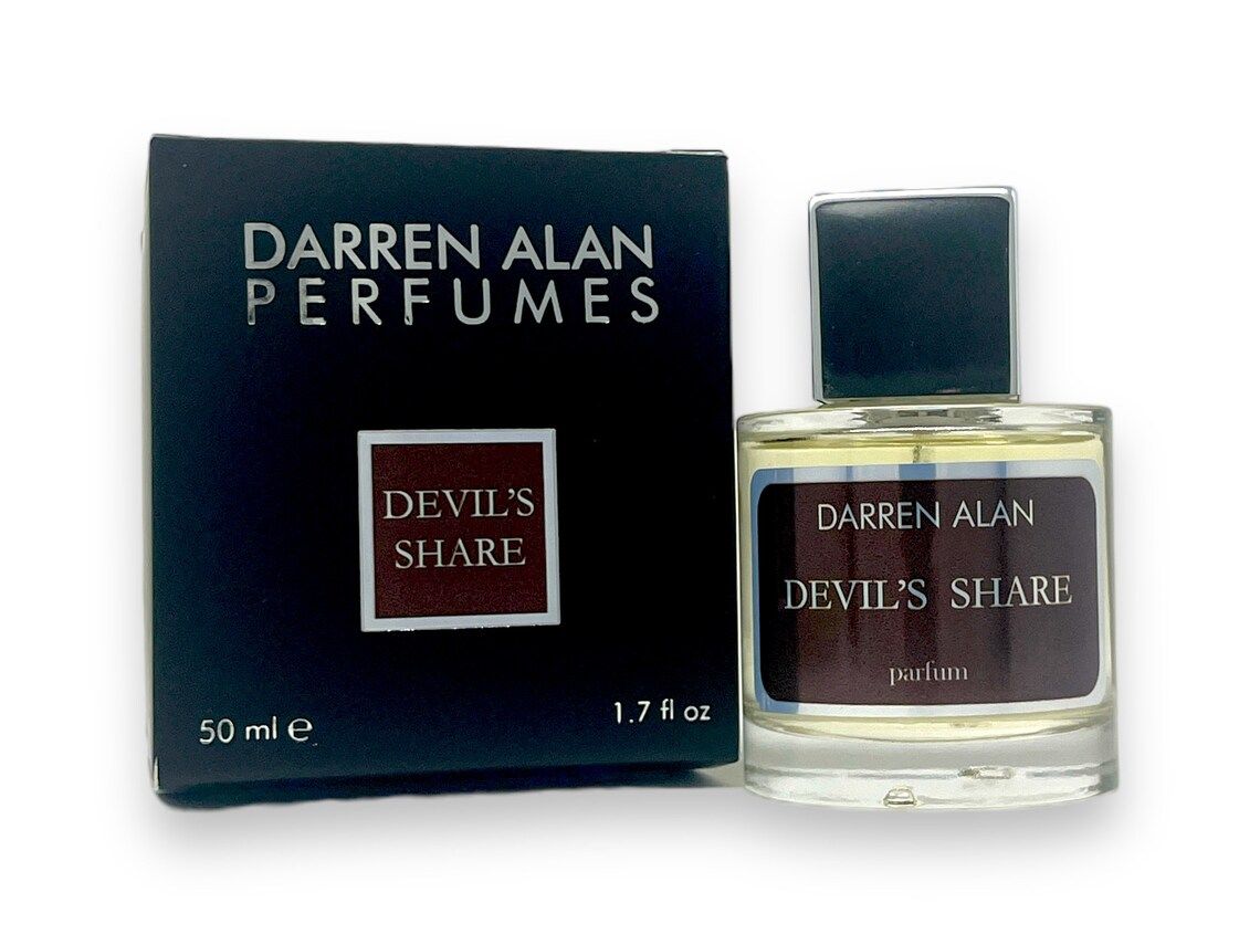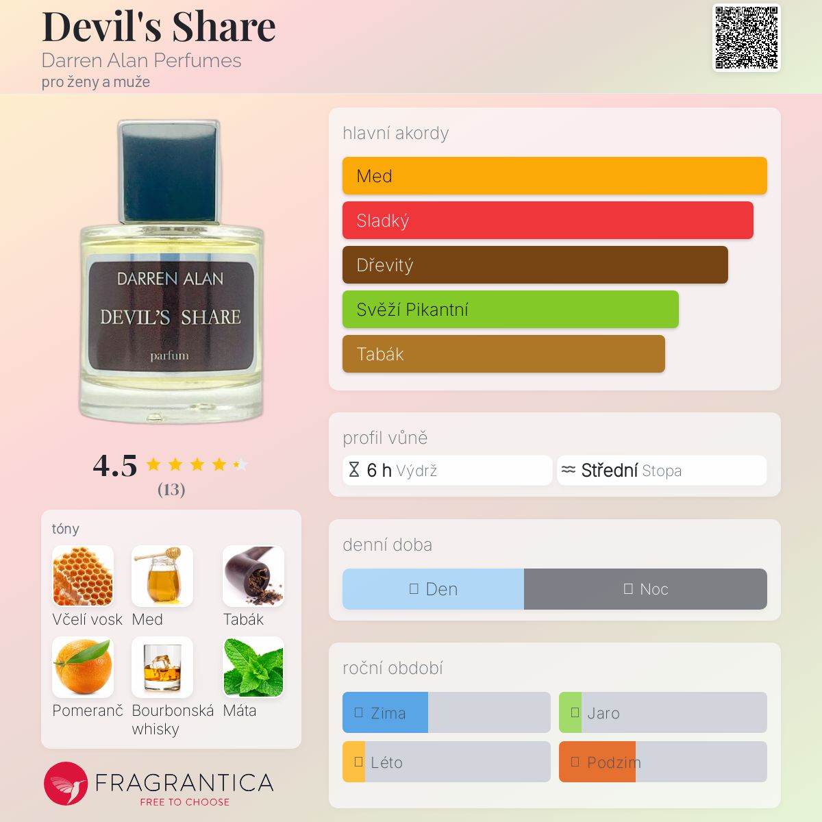 Devil's Share podle Darren Alan Perfumes je Citrus Gourmand vůně pro ženy a muže. Devil's Share byla spuštěna během 2020. "Nosem" za touto vůní je Darren Alan. Vrchní tóny jsou Pomeranč, Máta, Černý rybíz a Borovice; střední tóny jsouVčelí vosk, Med, Bourbonská whisky, Muškátový oříšek, Karamel a Hřebíček ; základní tóny jsou Tabákový list, Vanilka, Dub a Kakaový lusk.