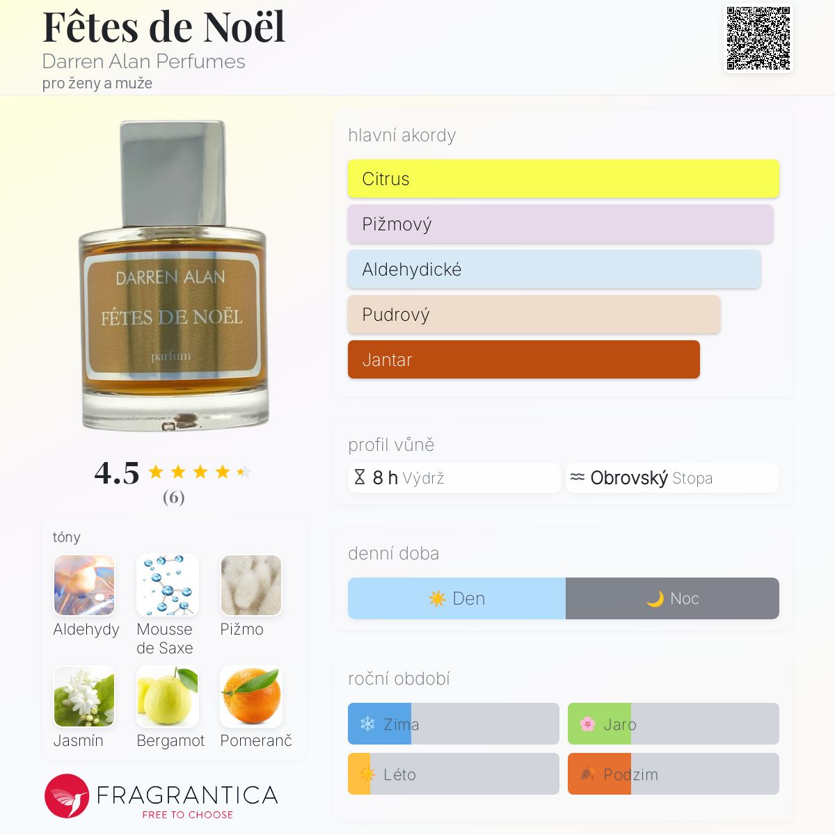Fêtes de Noël podle Darren Alan Perfumes je Chypre vůně pro ženy a muže. Fêtes de Noël byla spuštěna během 2020. "Nosem" za touto vůní je Darren Alan. Vrchní tóny jsou Aldehydy, Bergamot, Pomeranč, Hřebíček a Vřesna; střední tóny jsouJasmín, Růže de Mai, Ylang-Ylang a Tuberóza ; základní tóny jsou Mousse de Saxe, Pižmo, Pačuli, Labdanum, Orris, Santalové dřevo, Kadidlo, Cibetka, Ambra, Vanilka a Pryskyřice.