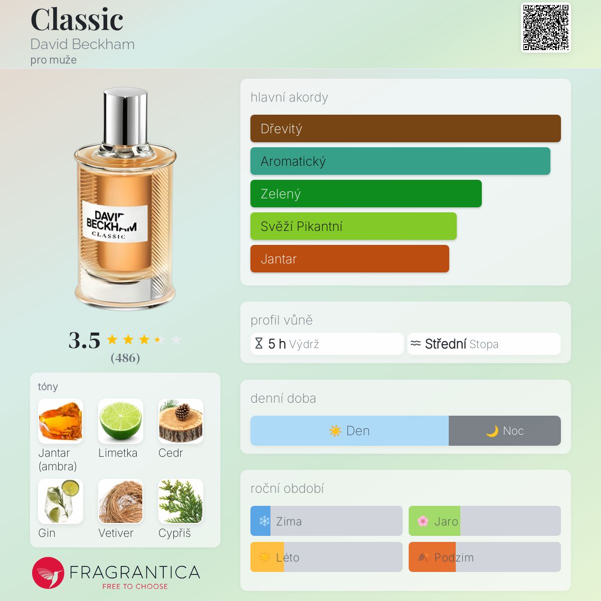 Classic podle David Beckham je Woody Aromatic vůně pro muže. Classic byl/a uveden/a v roce 2013. "Nosem" za touto vůní je Aurélien Guichard. Vrchní tóny jsou Limetka, Gin a Galbanum; střední tóny jsouCypřiš, Máta a Muškátový oříšek ; základní tóny jsou Jantar (ambra), Texaský cedr a Vetiver.