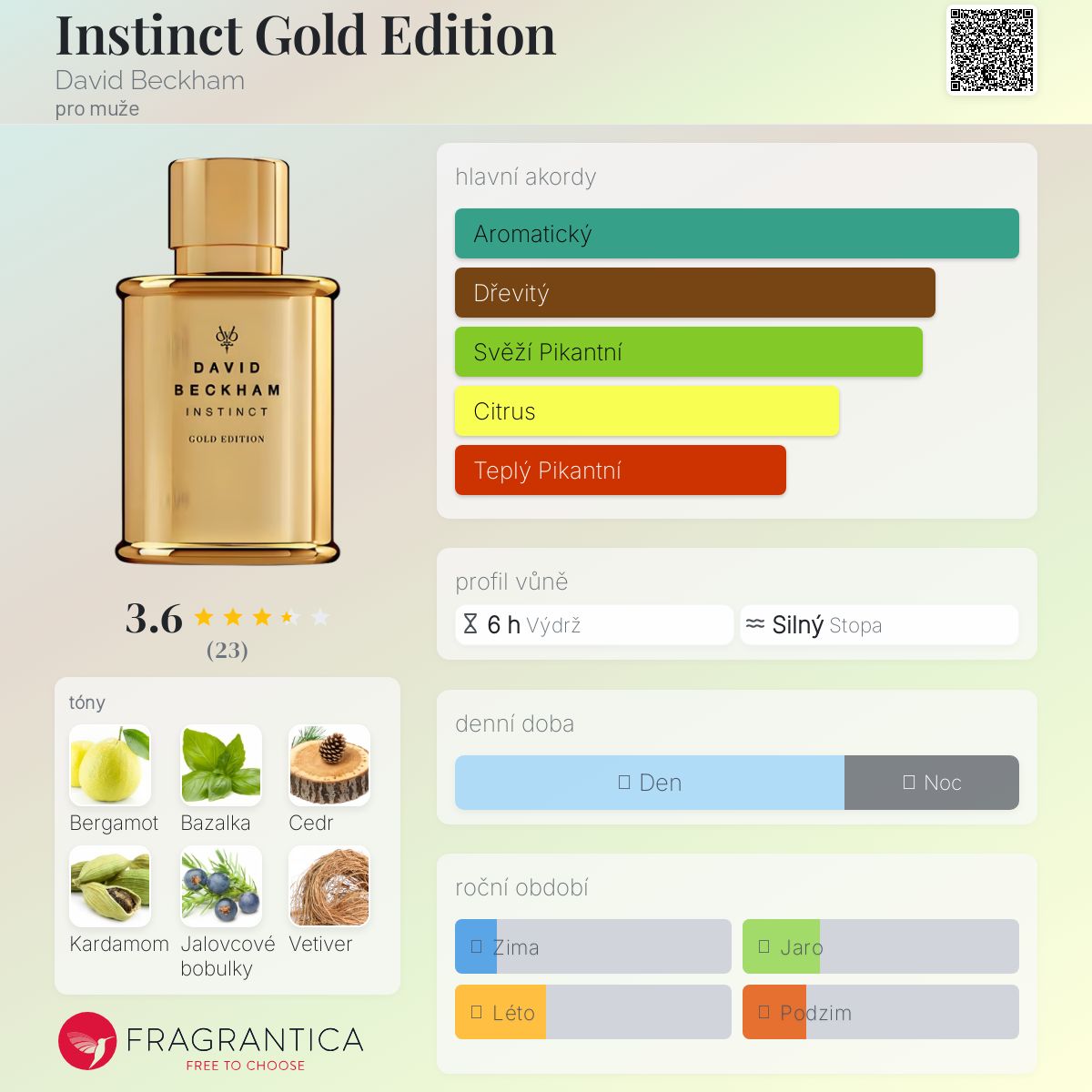 Instinct Gold Edition podle David Beckham je Woody Spicy vůně pro muže. Instinct Gold Edition byl/a uveden/a v roce 2015. "Nosem" za touto vůní je Alienor Massenet. Vrchní tóny jsou Bergamot, Bazalka a Citrón; střední tóny jsouKardamom, Jalovcové bobulky a Rozmarýn ; základní tóny jsou Cedr, Vetiver a Pačuli.