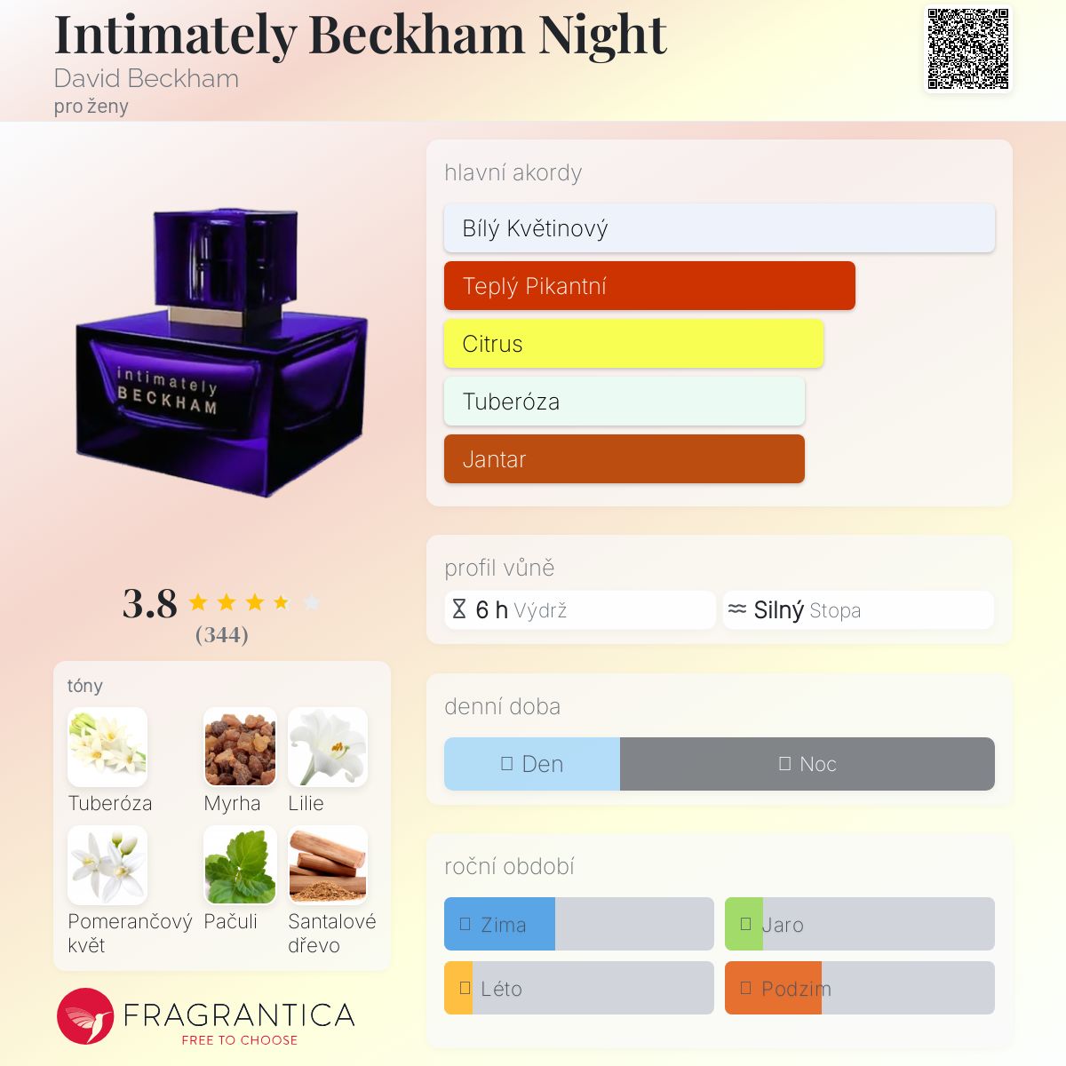 Intimately Beckham Night podle David Beckham je Floral vůně pro ženy. Intimately Beckham Night byl/a uveden/a v roce 2007. "Nosem" za touto vůní je Jean-Pierre Bethouart. Vrchní tóny jsou Skořice, Bergamot a Mandarinka; střední tóny jsouTuberóza, Lilie a Pomerančový květ ; základní tóny jsou Myrha, Pačuli, Santalové dřevo, Fazole tonka a Vanilka.