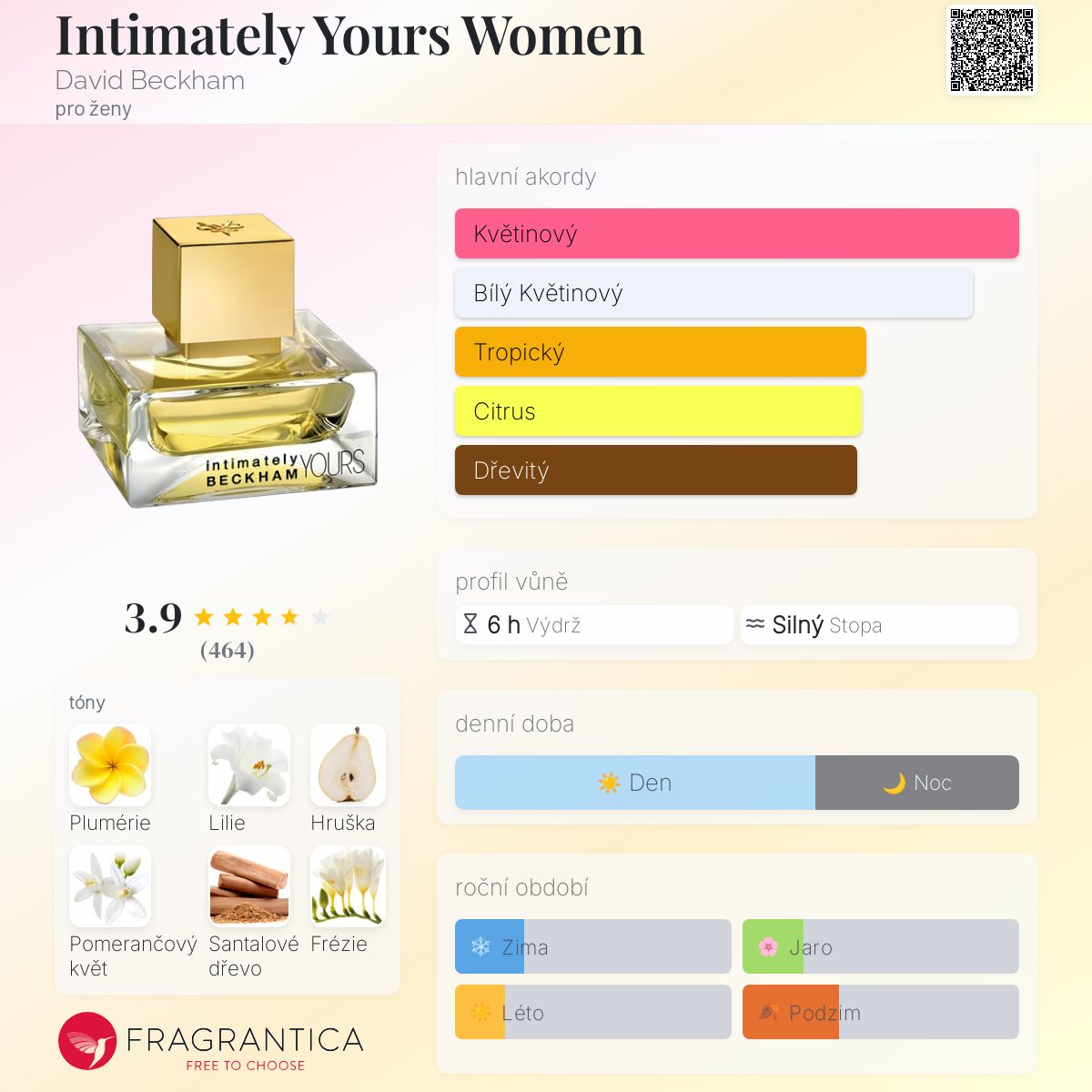 Intimately Yours Women podle David Beckham je Orientální Floral vůně pro ženy. Intimately Yours Women byl/a uveden/a v roce 2010. Vrchní tóny jsou Hruška, Frézie a Bergamot; střední tóny jsouPlumérie, Lilie a Květ afrického pomeranče ; základní tóny jsou Santalové dřevo, Vetiver a Kosatec.