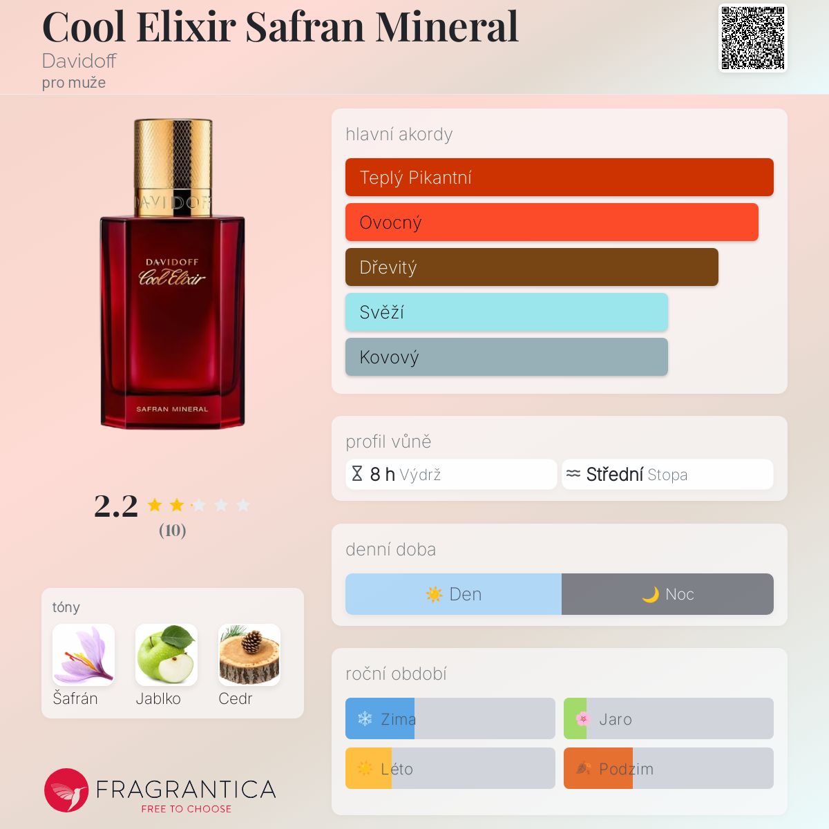 Cool Elixir Safran Mineral podle Davidoff je Woody Spicy vůně pro muže. Toto je nová vůně. Cool Elixir Safran Mineral byl/a uveden/a v roce 2026.