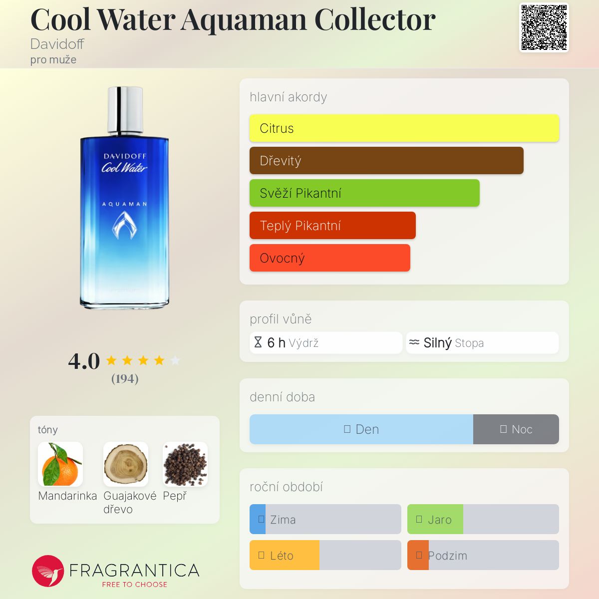 Cool Water Aquaman Collector podle Davidoff je Woody Spicy vůně pro muže. Cool Water Aquaman Collector byl/a uveden/a v roce 2020. "Nosem" za touto vůní je Jérôme di Marino. Vrchní tón je Zelená mandarinka ; střední tón jeČerný pepř ; základní tón je Guajakové dřevo.