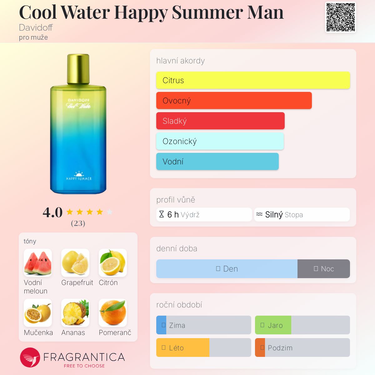 Cool Water Happy Summer Man podle Davidoff je Aromatic Fruity vůně pro muže. Cool Water Happy Summer Man byl/a uveden/a v roce 2007. Vrchní tóny jsou Grapefruit, Citrón, Pomeranč a Mandarinka; střední tóny jsouVodní meloun, Mučenka, Ananas, Zelené jablko, Jasmín a Fialkový list ; základní tóny jsou Pižmo, Cedr, Pačuli a Dřevité tóny.