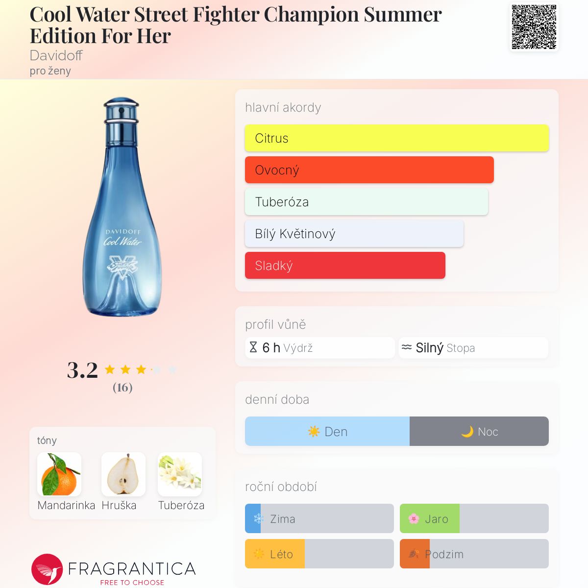 Cool Water Street Fighter Champion Summer Edition For Her podle Davidoff je Floral Fruity vůně pro ženy. Cool Water Street Fighter Champion Summer Edition For Her byl/a uveden/a v roce 2021. "Nosem" za touto vůní je Jerome di Marino. Vrchní tón je Mandarinka ; střední tón jeHruška ; základní tón je Tuberóza.