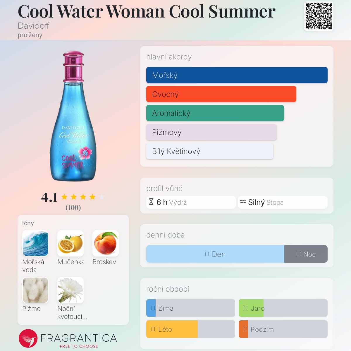 Cool Water Woman Cool Summer podle Davidoff je Aromatic Aquatic vůně pro ženy. Cool Water Woman Cool Summer byl/a uveden/a v roce 2009. Vrchní tóny jsou Mořská voda a Mučenka; střední tón jeNoční kvetoucí cereus (kaktus) ; základní tóny jsou Broskev a Pižmo.