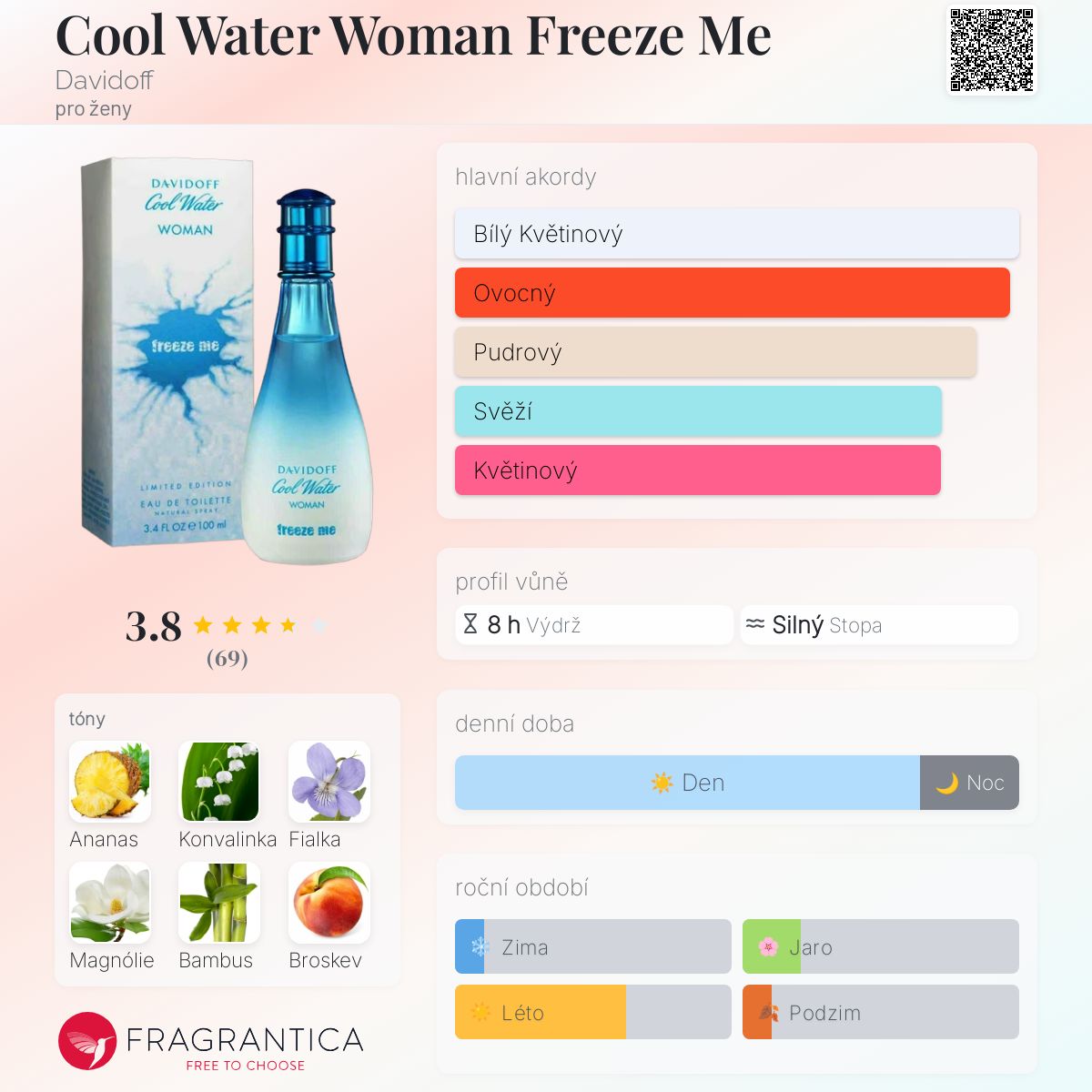 Cool Water Woman Freeze Me podle Davidoff je Floral Fruity vůně pro ženy. Cool Water Woman Freeze Me byl/a uveden/a v roce 2008. "Nosem" za touto vůní je Pierre Bourdon. Vrchní tón je Ananas ; střední tóny jsouKonvalinka, Fialka, Magnólie, Bambus a Jasmín ; základní tóny jsou Broskev, Kořen orris, Pižmo, Santalové dřevo a Jantar (ambra).