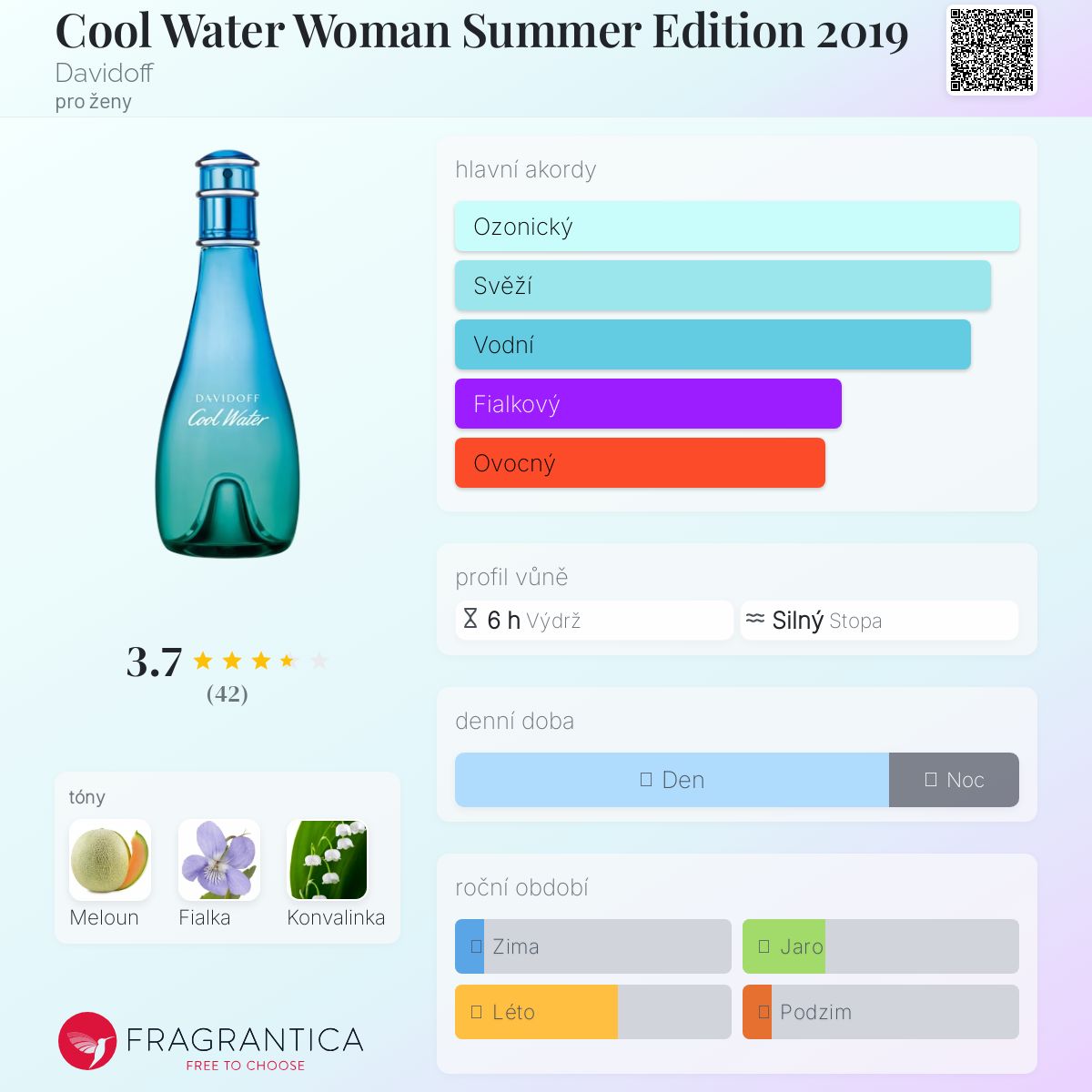 Cool Water Woman Summer Edition 2019 podle Davidoff je Floral Fruity vůně pro ženy. Cool Water Woman Summer Edition 2019 byl/a uveden/a v roce 2019. Vrchní tón je Meloun ; střední tón jeKonvalinka ; základní tón je Kořen fialky.