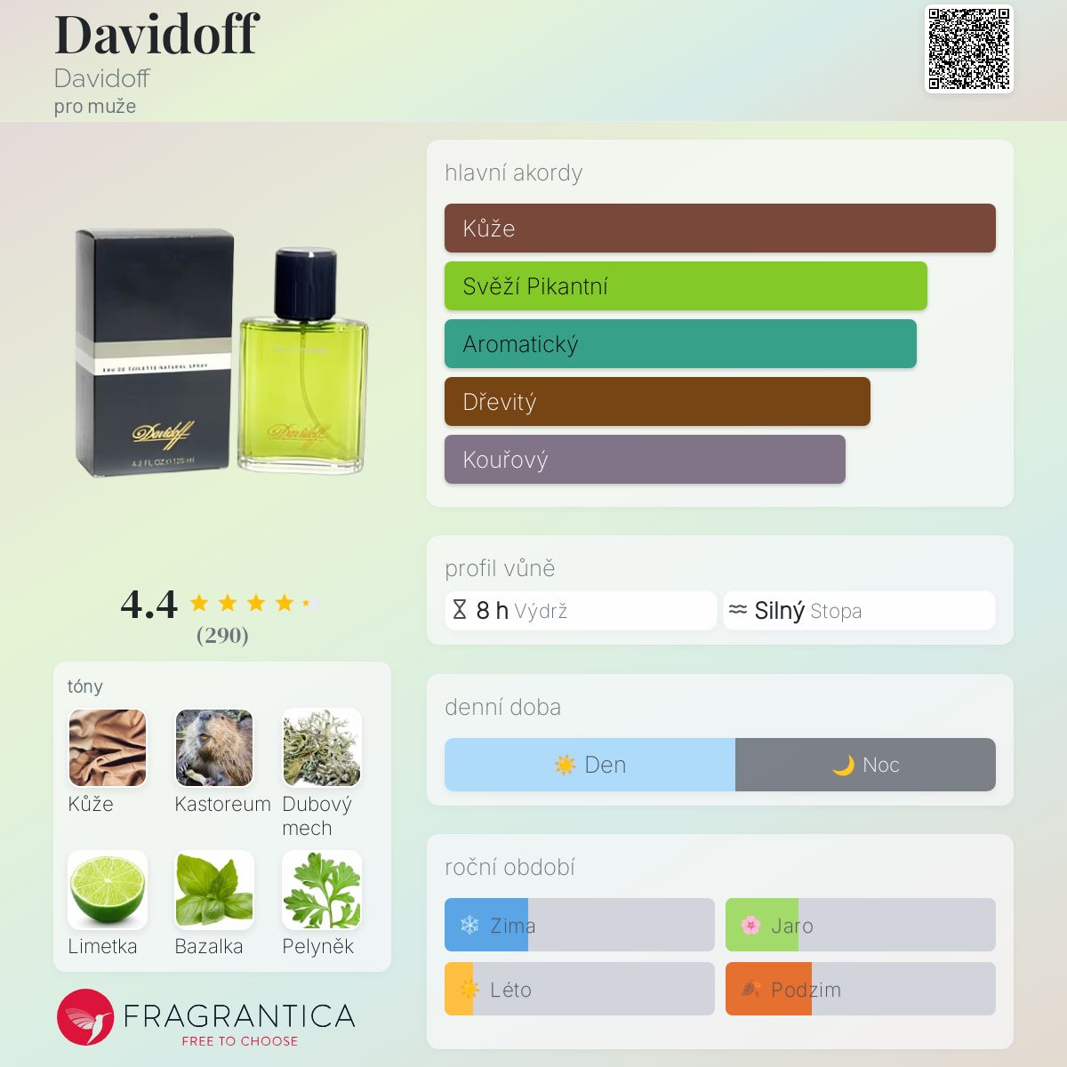 Davidoff podle Davidoff je Chypre vůně pro muže. Davidoff byl/a uveden/a v roce 1984. "Nosem" za touto vůní je Edouard Flechier. Vrchní tóny jsou Limetka, Bazalka, Pelyněk a Citrón; střední tóny jsouKarafiát, Kmín, Růže a Kořen kosatce ; základní tóny jsou Kůže, Kastoreum, Dubový mech a Pačuli.