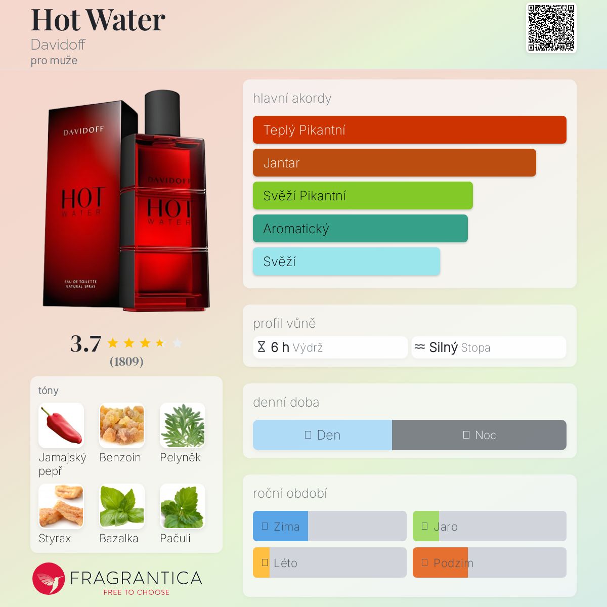 Hot Water podle Davidoff je Orientální Spicy vůně pro muže. Hot Water byl/a uveden/a v roce 2009. Vrchní tóny jsou Pelyněk a Bazalka; střední tóny jsouPaprika a Pačuli ; základní tóny jsou Benzoin a Styrax.