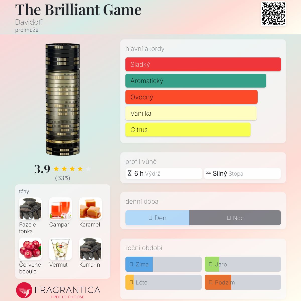 The Brilliant Game podle Davidoff je Orientální Woody vůně pro muže. The Brilliant Game byl/a uveden/a v roce 2014. "Nosem" za touto vůní je Jacques Huclier. Vrchní tóny jsou Campari, Červené bobule, Vermut, Hořký pomeranč, Citrón a Šalvěj muškátová; střední tóny jsouCedr a Pomerančový květ ; základní tóny jsou Fazole tonka, Karamel, Kumarin a Seno.
