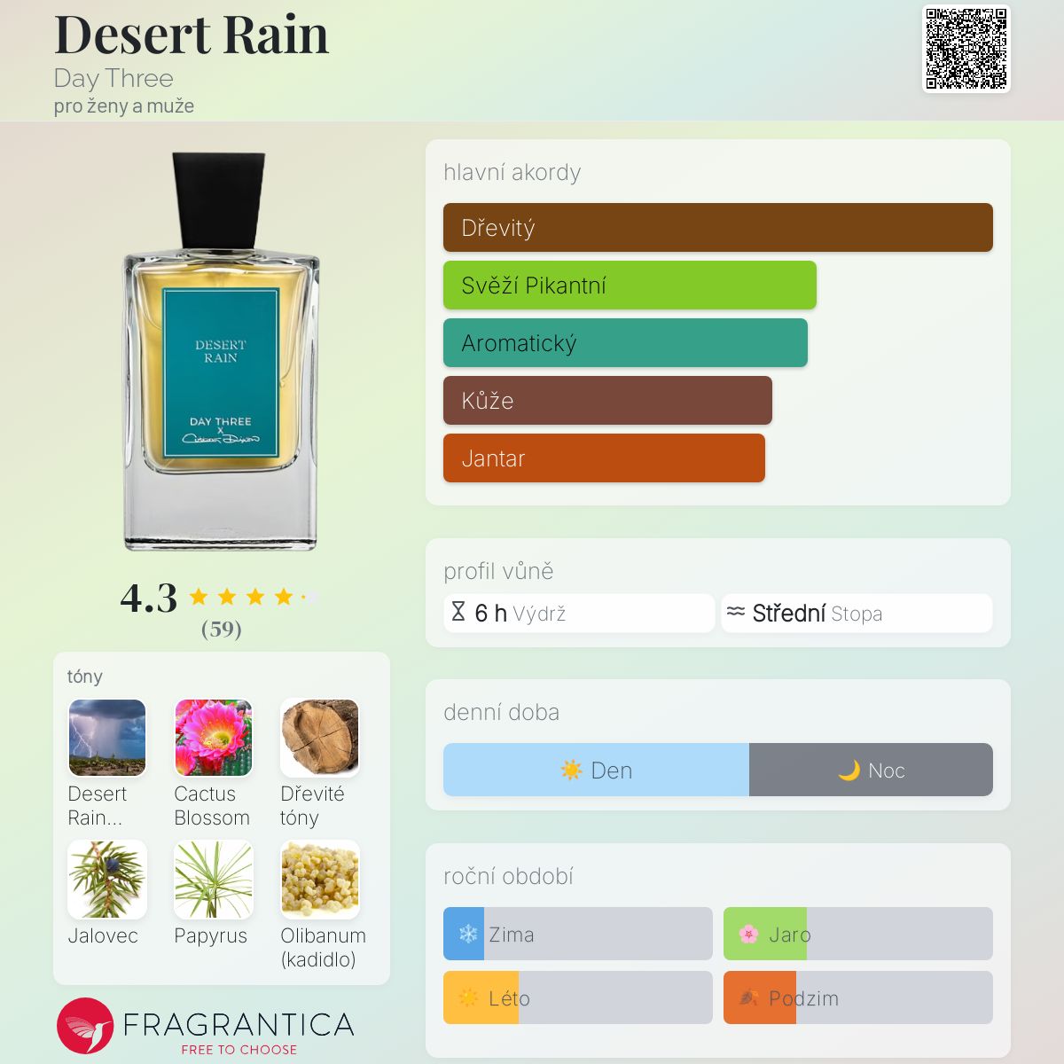 Desert Rain podle Day Three je Woody Aromatic vůně pro ženy a muže. Toto je nová vůně. Desert Rain byl/a uveden/a v roce 2025. "Nosem" za touto vůní je Michael Paul. Vrchní tóny jsou Cactus Blossom, Jalovec, Bergamot a Muškátový oříšek; střední tóny jsouDesert Rain Accord, Papyrus, Zelený čaj a Šalvěj ; základní tóny jsou Dřevité tóny, Olibanum, Kůže a Santalové dřevo.
