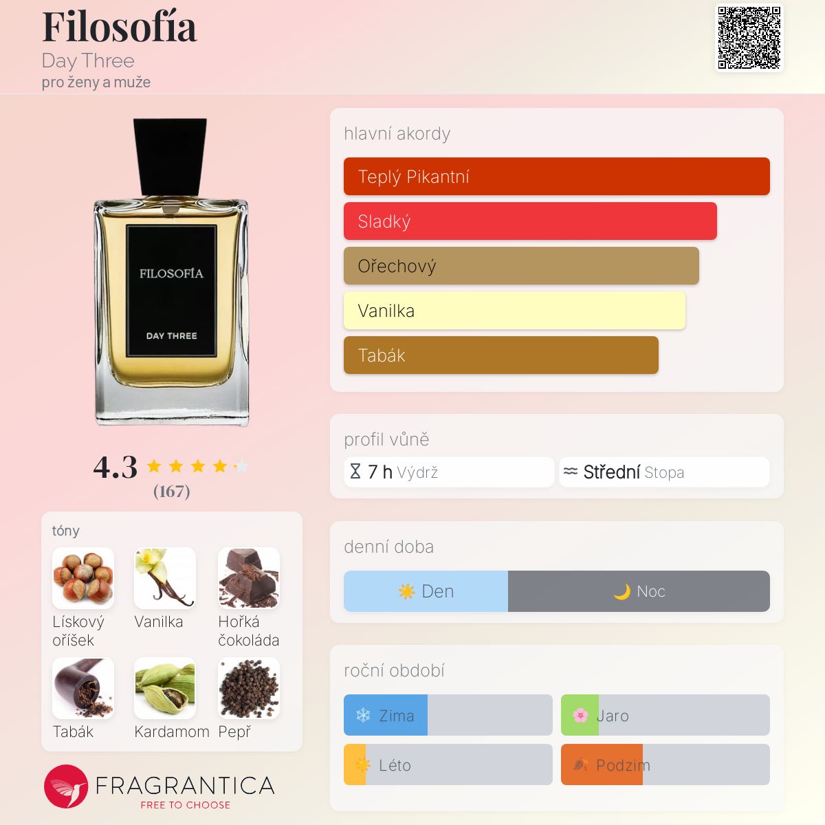 Filosofía podle Day Three je Aromatic Spicy vůně pro ženy a muže. Filosofía byl/a uveden/a v roce 2023. Vrchní tóny jsou Kardamom a Černý pepř; střední tóny jsouTabák a Agarové dřevo (oud) ; základní tóny jsou Lískový oříšek, Vanilka a Čokoláda.