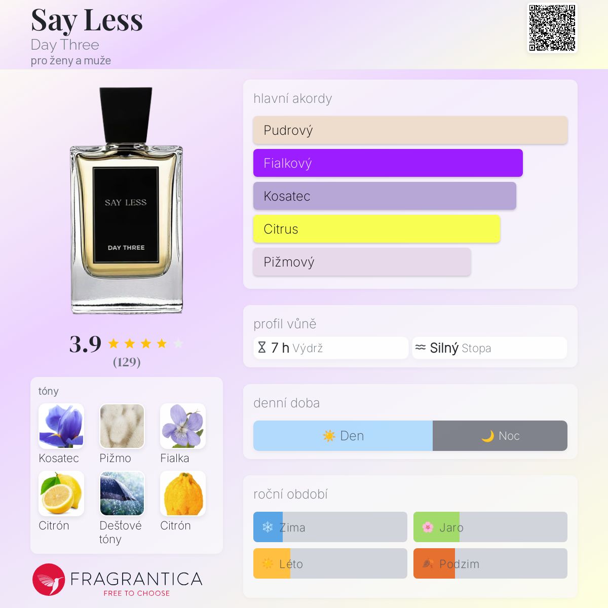 Say Less podle Day Three je Floral Woody Musk vůně pro ženy a muže. Say Less byl/a uveden/a v roce 2023. Vrchní tóny jsou Citrón, Zedrát a Bergamot; střední tóny jsouKosatec, Fialka, Dešťové tóny, Liči a Narcis ; základní tóny jsou Pižmo, Dřevité tóny a Jantar (ambra).