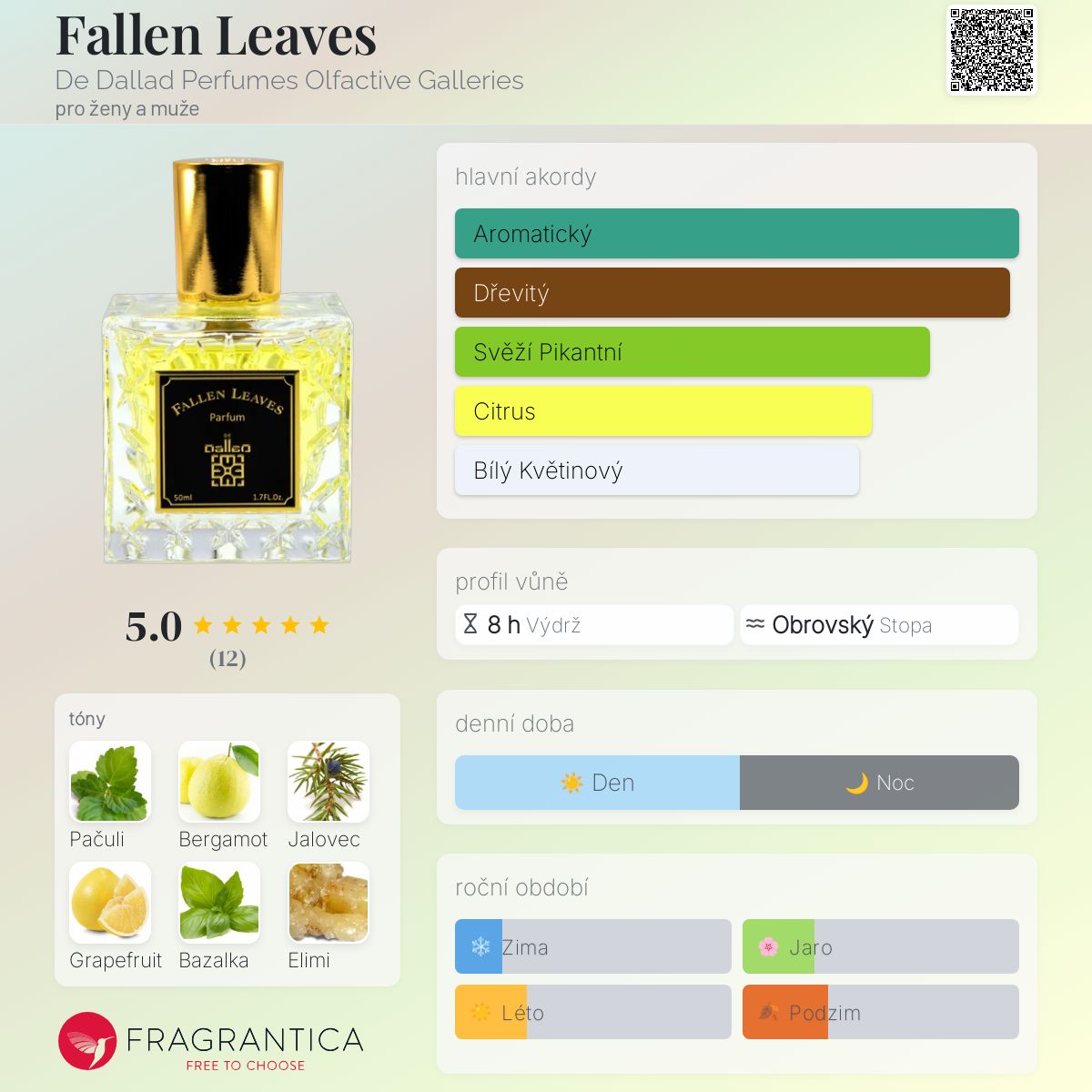 Fallen Leaves podle De Dallad Perfumes Olfactive Galleries je Woody Chypre vůně pro ženy a muže. Fallen Leaves byl/a uveden/a v roce 2022. "Nosem" za touto vůní je Farooq Jamil. Vrchní tóny jsou Bergamot, Jalovec, Grapefruit, Bazalka a Elimi; střední tóny jsouJasmín, Bílé květy, Růže, Kadidlo a Minerální tóny ; základní tóny jsou Pačuli, Vetiver, Bílé pižmo a Cedr.