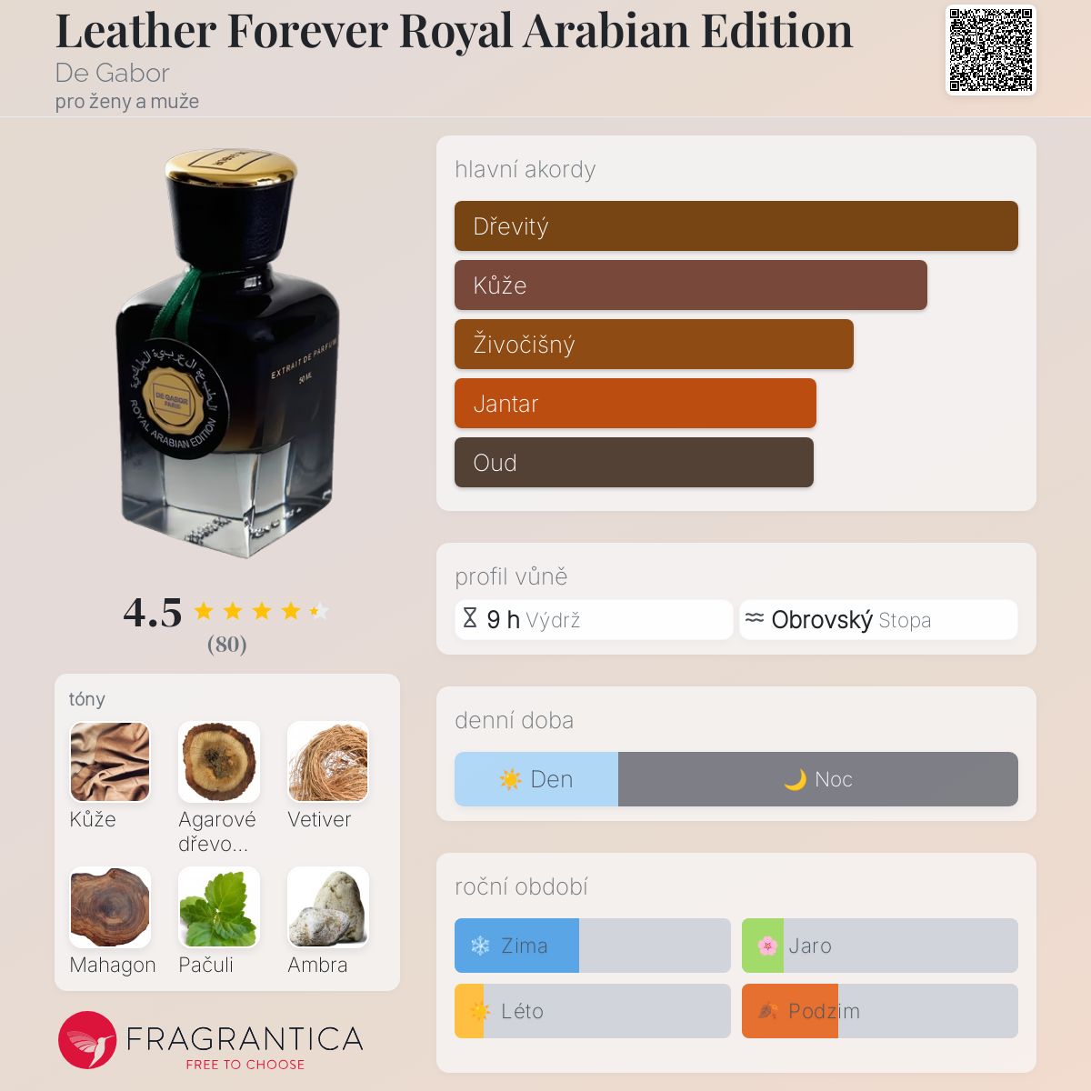 Leather Forever Royal Arabian Edition podle De Gabor je Leather vůně pro ženy a muže. Leather Forever Royal Arabian Edition byl/a uveden/a v roce 2022. "Nosem" za touto vůní je Gabriel Gabor. Vrchní tóny jsou Kůže, Whisky, Vlašský ořech, Rum, Fík, Šafrán a Datle; střední tóny jsouKůže, Vetiver, Mahagon, Pačuli, Guajakové dřevo a Kořen orris ; základní tóny jsou Kůže, Agarové dřevo (oud), Ambra, Kadidlo, Jantar (ambra), Santalové dřevo a Pižmo.